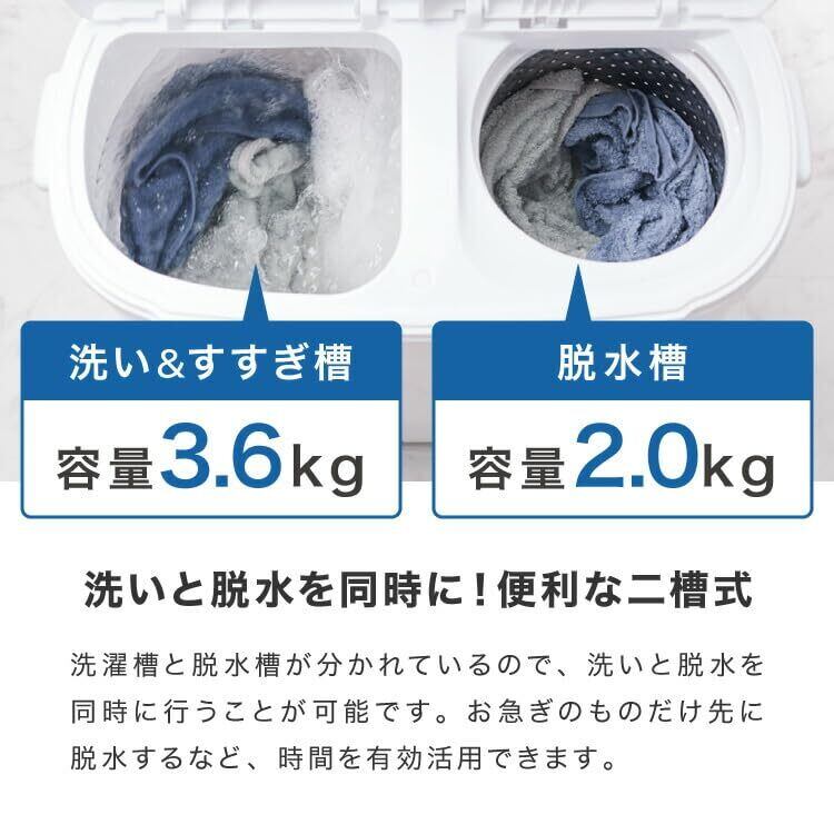 【商品詳細】電源:AC100V 50/60HZ 消費電力:85W 洗濯容量:3.6kg 脱水容量:2.0kg 排水ホース:460mm 電源コード:1400mm 製品重量:9kg 定格消費電力:240W サイズ:約550×345×575mm