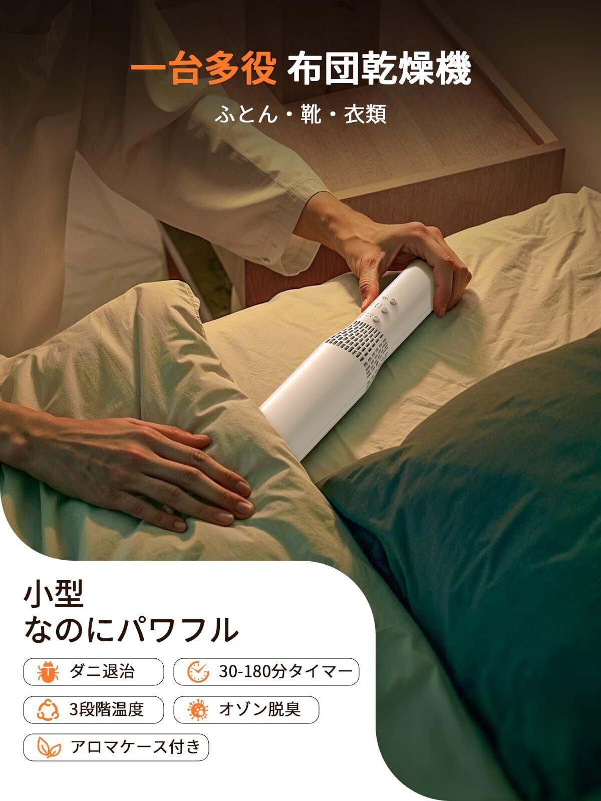【業界初のW清潔:ダニ対策×オゾン消臭】本製品は、業界で初めてダニ退治機能とオゾン消臭機能を同時搭載した布団乾燥 機です。ダニ対策により肌のかゆみの原因となるダニをしっかりケアし、清潔で快適な睡眠環境を保ちます。オゾン機能を使えば、梅雨時の衣類・布団の湿ったニオイや、夏に汗を吸った靴のこもったニオイもすばやく分解してリフレッシュできます。さらに、付属のアロマケースと脱脂綿にお好みのアロマオイル(※別途ご用意ください)を加えれば、乾燥中にやさしい香りが広がり、寝室が癒しの空間に。これ一台で、日々のニオイ・湿気・ダニ対策を手軽にまとめて行えます。
