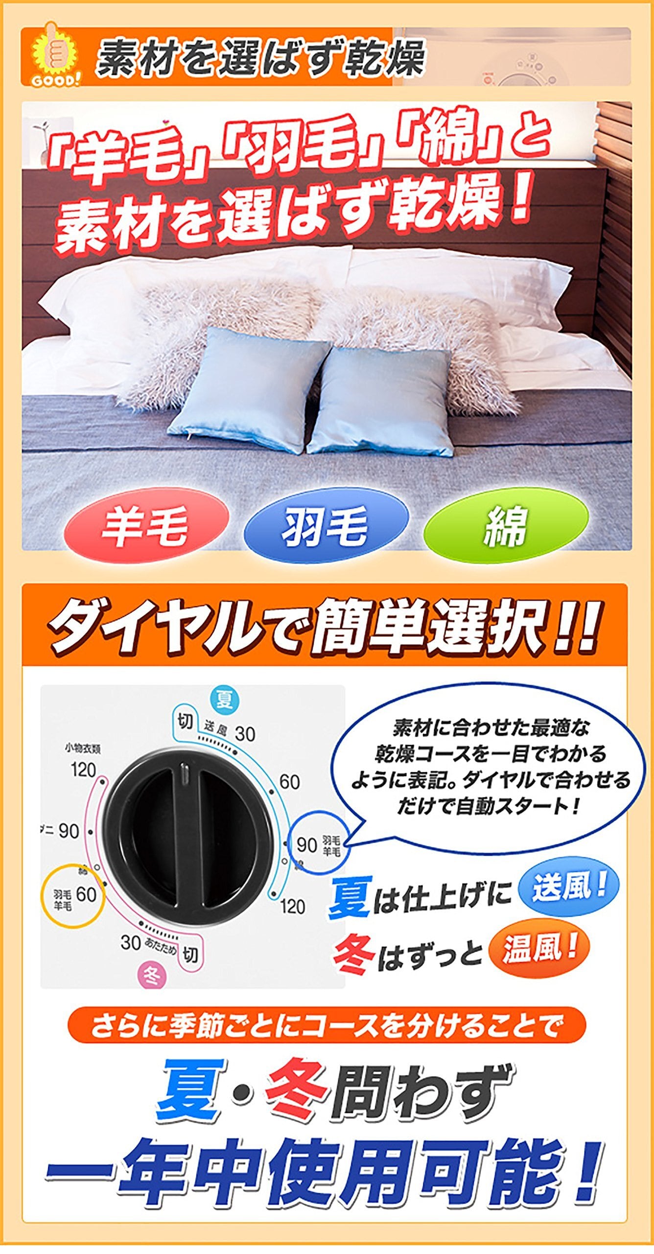 ●夏はカラっと、冬はあったか、オールシーズン使えるふとん乾燥機