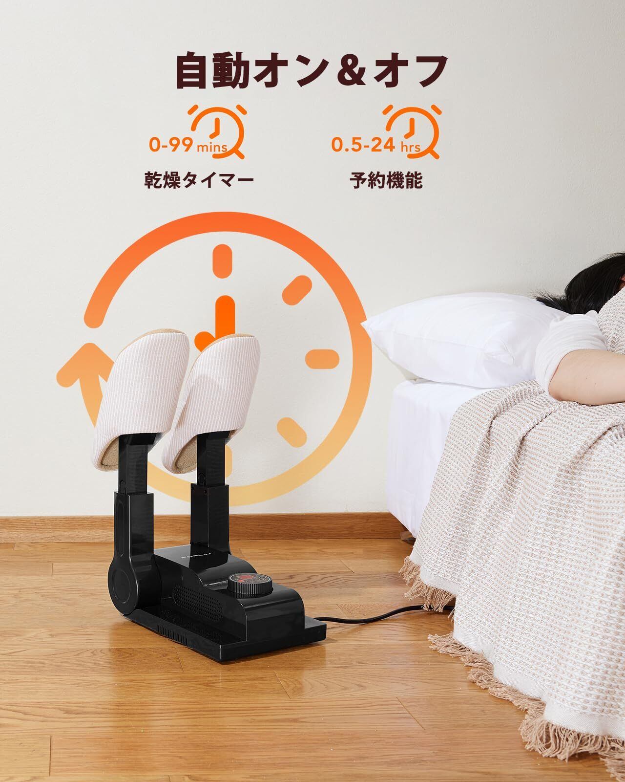 【便利な予約機能】さらに、予約機能(0.5~24時間)を使えば、指定した時間に自動的に乾燥機能をオンにして、濡れた靴を乾燥させることができます。寒い冬の夜にタイマーをセットしておけば、翌朝には暖かい靴でお出かけできます。また、夏の旅行やアウトドアにも便利で、乾燥開始時間を事前に予約しておけば、快適な靴を履いて出かけます。