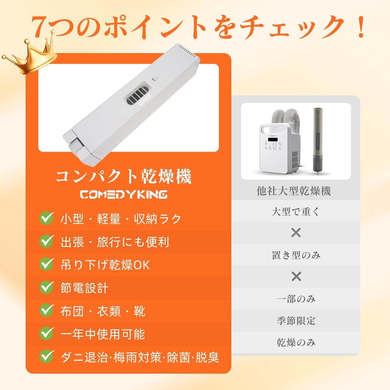 【日本仕様に進化!梅雨も冬もこれ一台!全季節いつでもサラッと快適乾燥】世界で100万台以上を売り上げたCOMEDYKINGミニ多機能布団乾燥機が、ついに日本仕様に進化。衣類乾燥機モード、靴乾燥機モードは、梅雨の湿気、花粉シーズン、寒い冬の朝――どんな季節でも、衣類・布団・靴まで一台で「乾燥・除菌・消臭・温め」をスピーディに実現します。最大90℃の高温風と450Wの強力出力で、わずか10分でふんわり清潔な仕上がりに。コンパクト&軽量設計で、旅行や出張、一人暮らしの部屋でも手軽に使えます。さらに97.7%除菌効果と節電設計で、毎日をより快適に、より心地よく。ギフトとしても喜ばれる、全季節対応の頼れる一台。COMEDYKINGが、あなたの一年中の暮らしに「清潔」と「ぬくもり」を届けます。