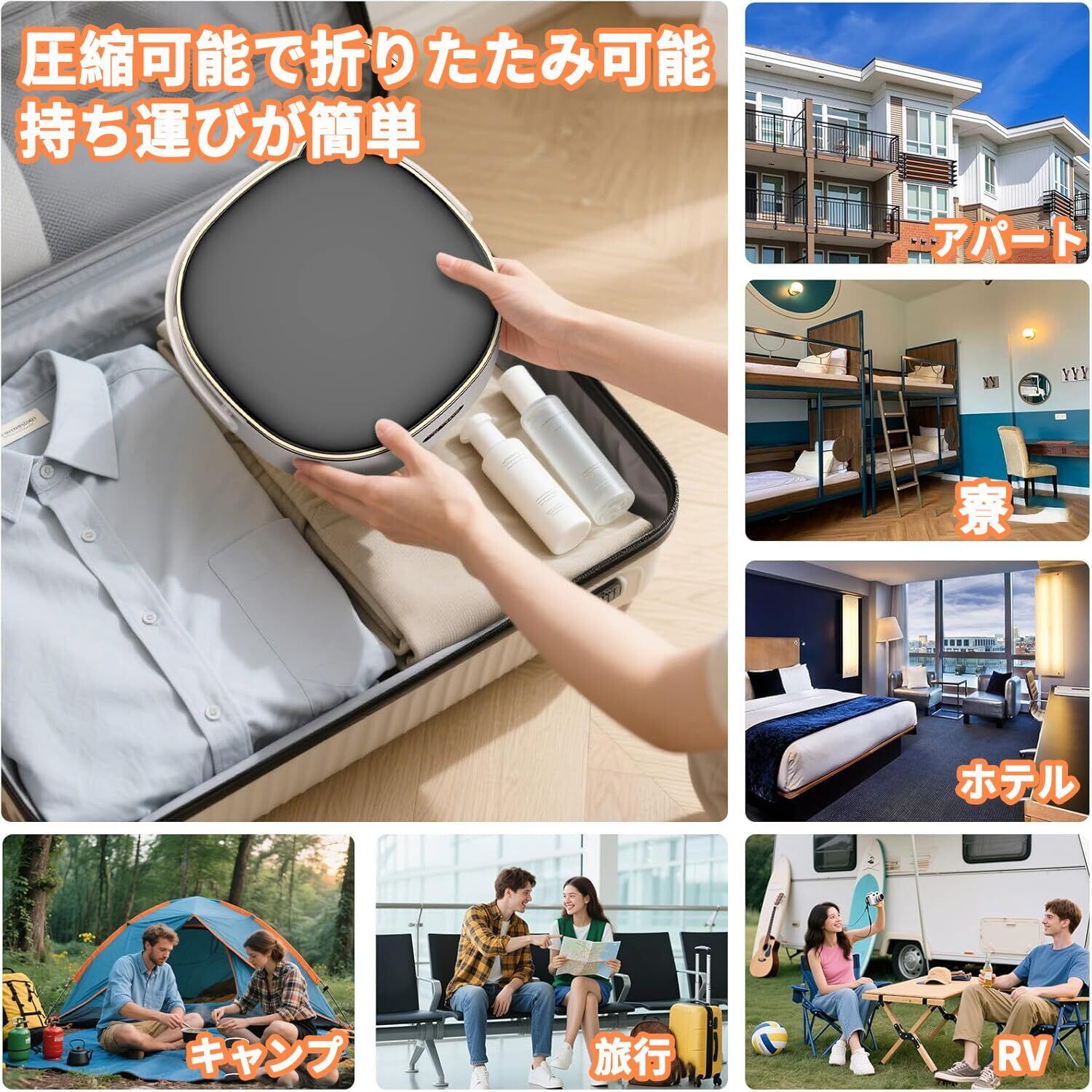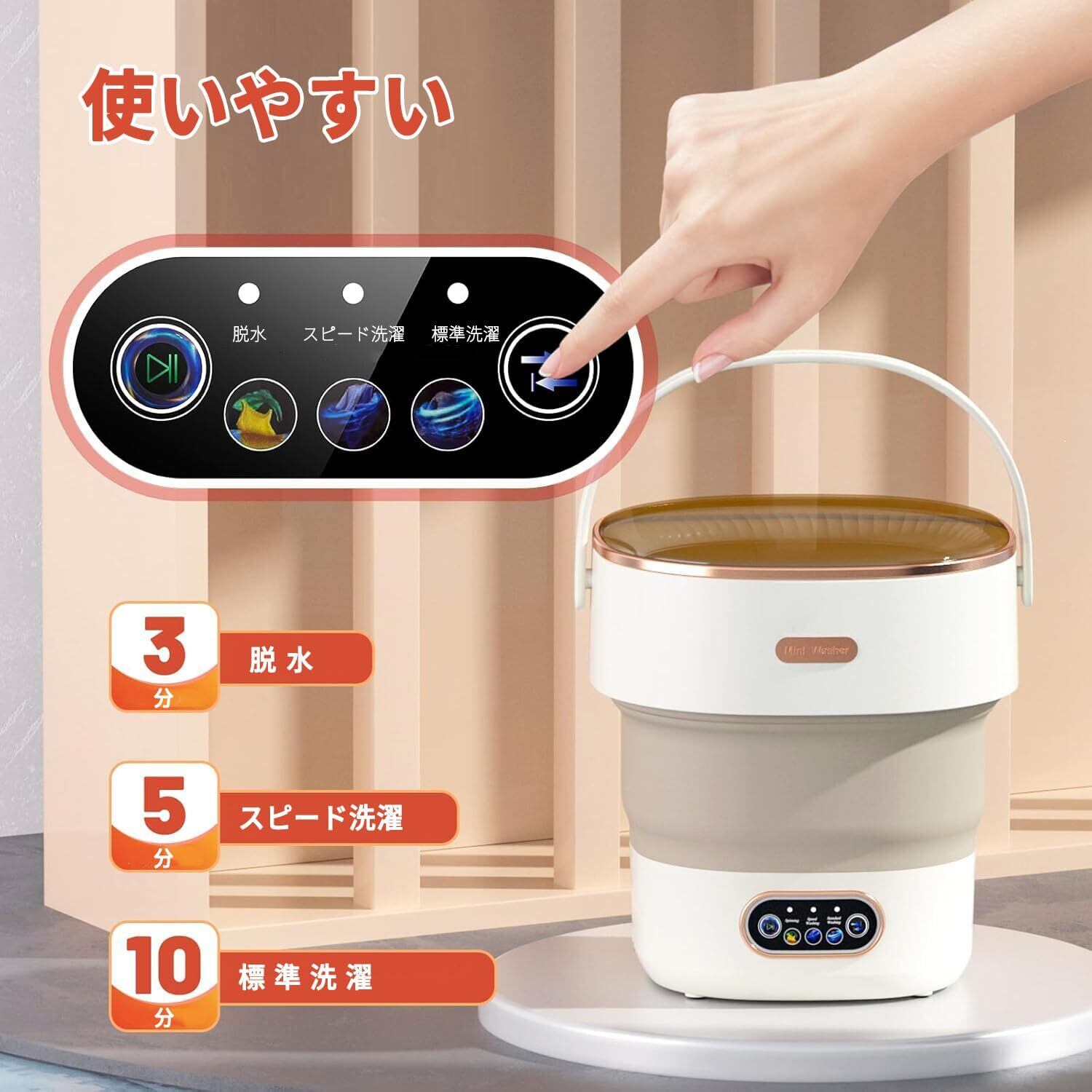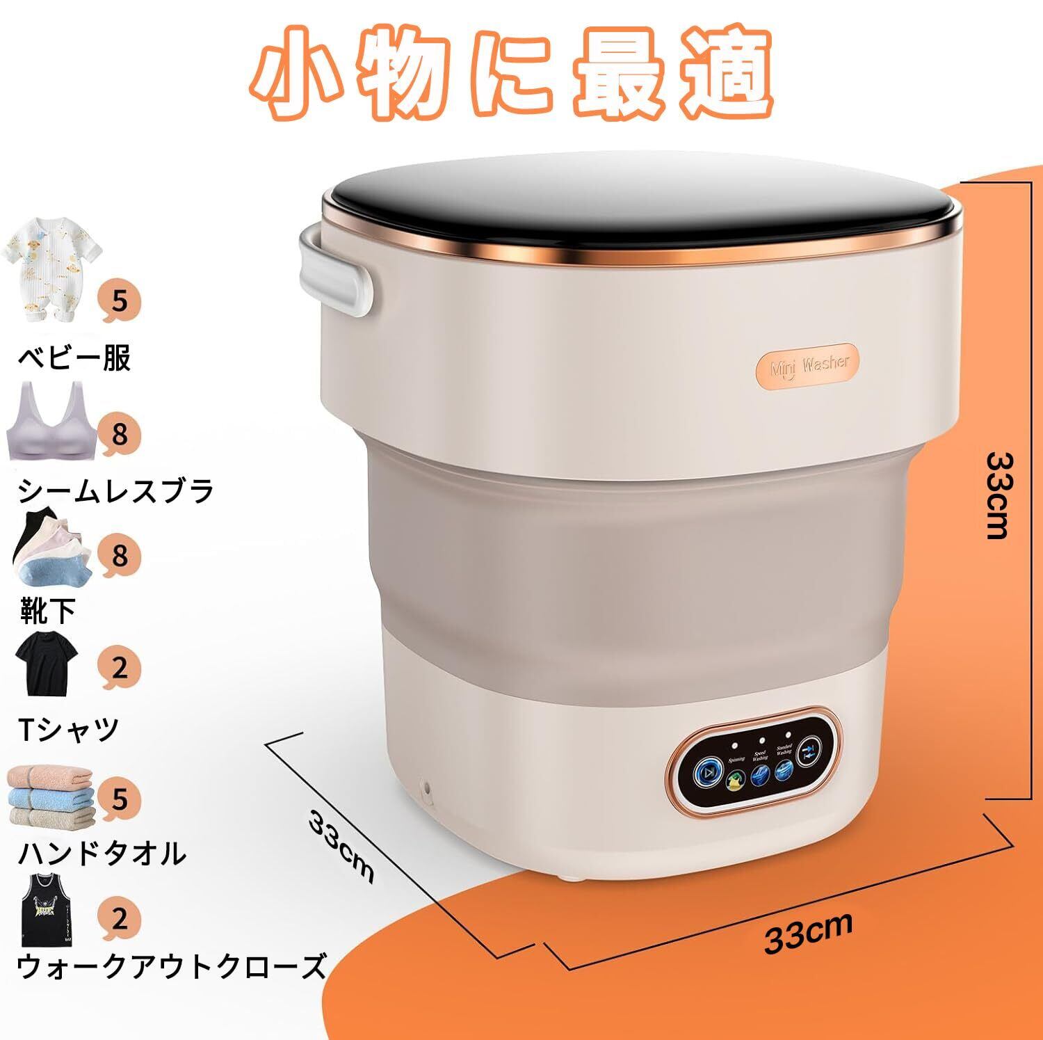 【折りたたみ】ポータブル洗濯機は、32×32×18cmの精巧なサイズに折りたためる。いすやベッドの下に隠れ、スペースの美学と実用性を兼ね備える。