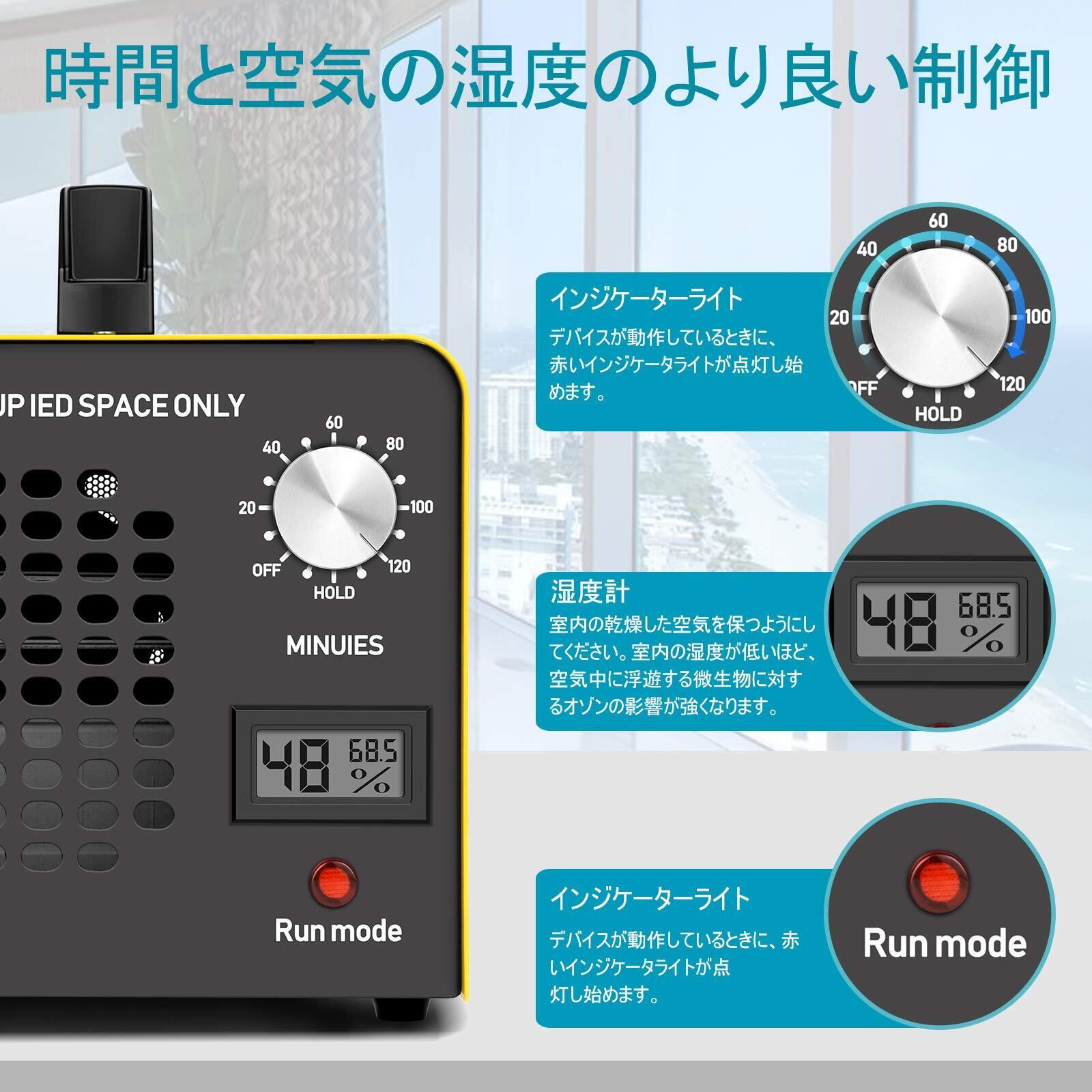 最大120分間で自動的にオフするタイマーを内蔵しており、スイッチを入れて部屋を出れば設定時間後には消臭が完了しています。 この消臭器は、密閉された空間でのみ使用可能で消臭動作中、人は部屋には入らないでください。 ペットなどの動物も同様に入れません。