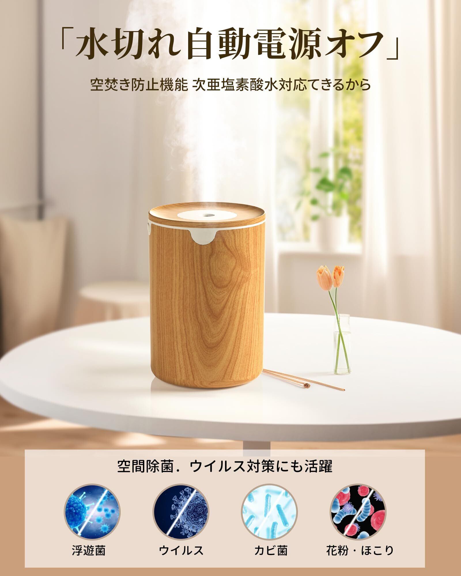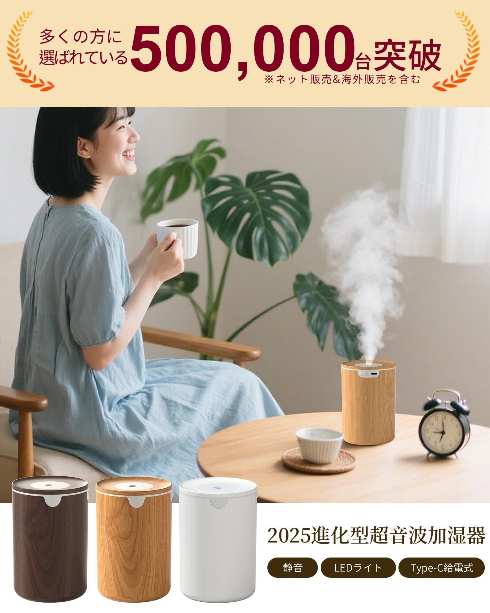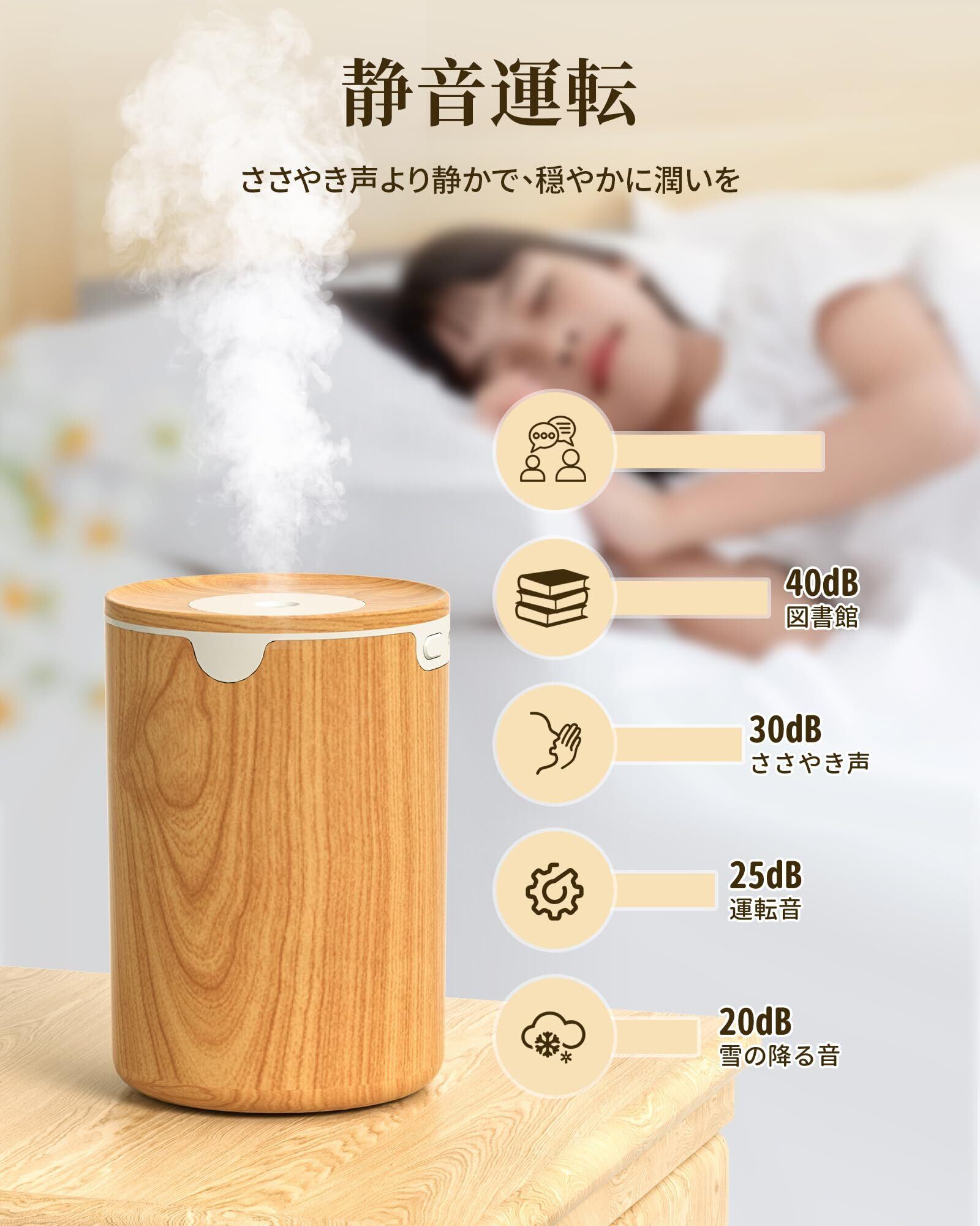 【2025新進化モデル加湿器・木目調】加湿器 小型 卓上 大容量 320ML 除菌 アロマ対応 LEDライト 超音波式 静音 卓上 自動停止機能 空焚き防止 お手入れ簡単 デスク 寝室 オフィス 車用 リビング 次亜塩素酸水対応 乾燥/花粉症対策(ライトウッド)