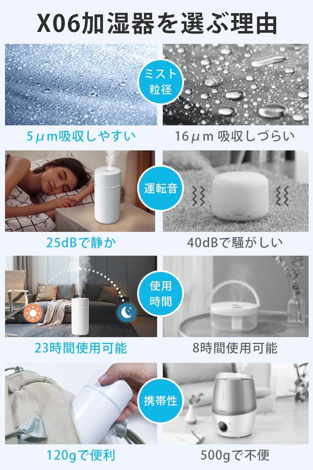 【卓上コンパクト設計 超音波の超微細ミスト】 X06加湿器は、新方式の超音波技術で直径約5μmの微細ミストを噴出。浸透力が高く、室内の隅々まで素早く均一に加湿します。肌や喉の乾燥を効率よくケアし、350mlの容量で最大23時間稼働可能。卓上に置けるコンパクトなサイズでの小型軽量設計により、デスクやオフィスの限られたスペースでも邪魔になりません。