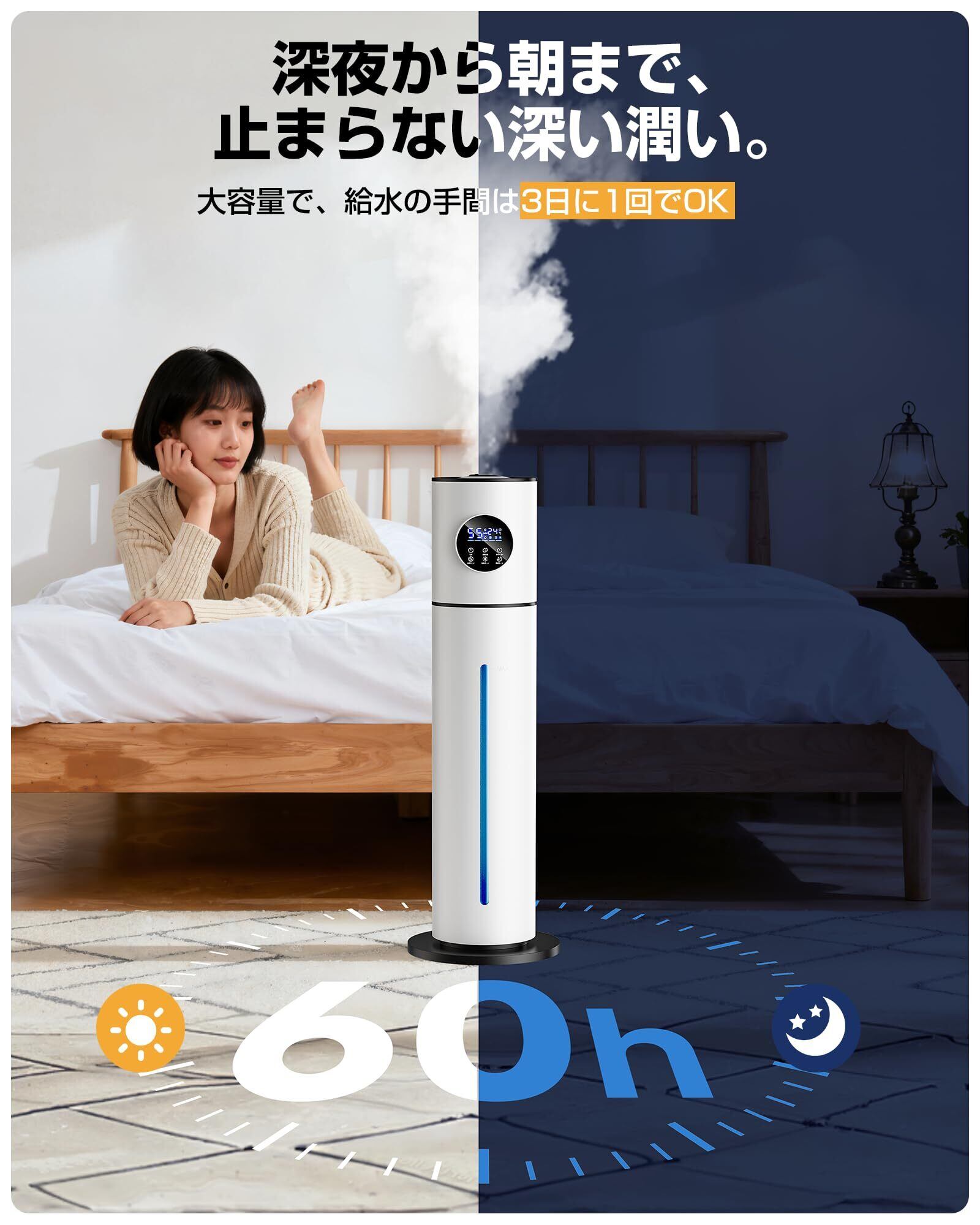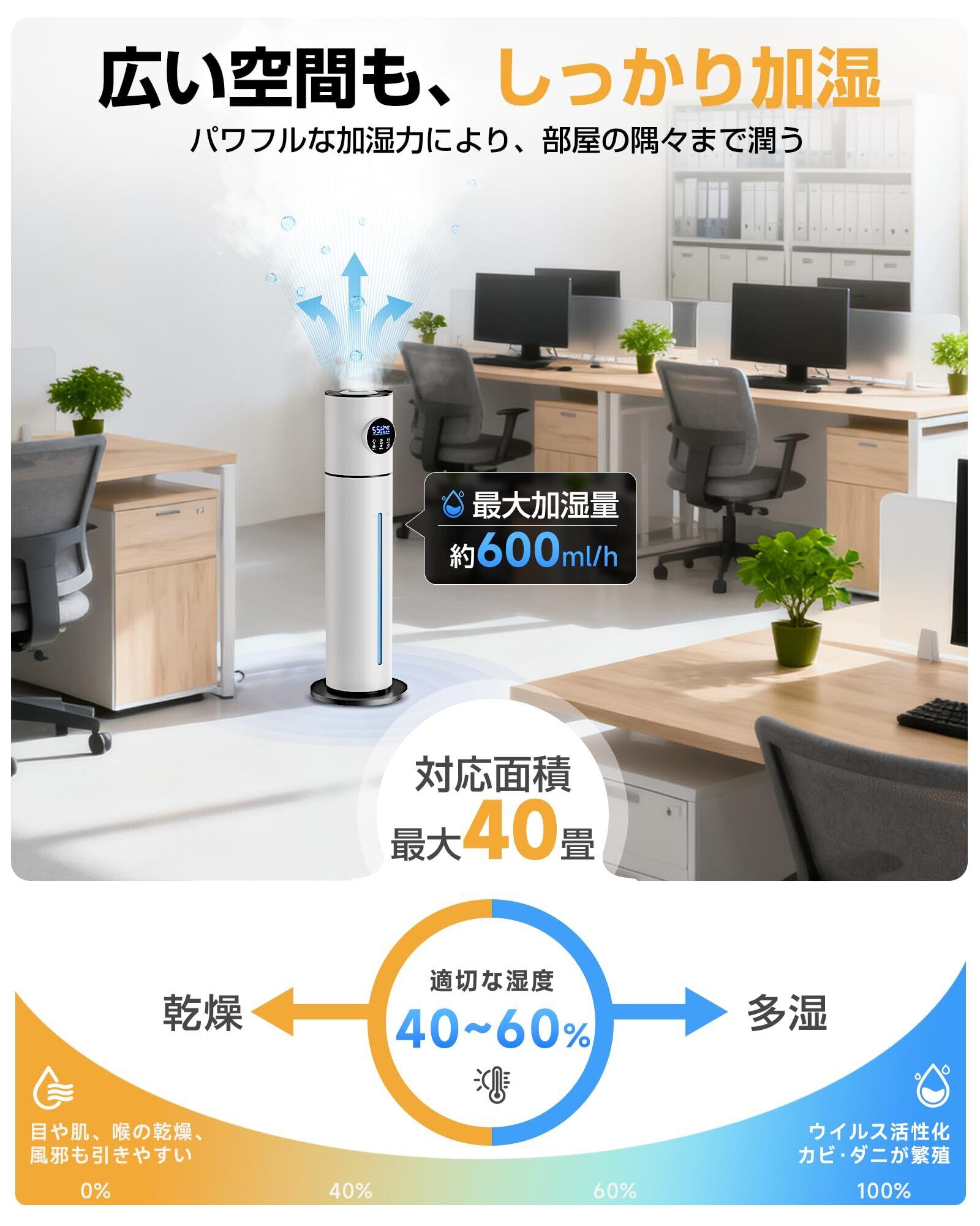【360°回転ノズル&スマート湿度制御で家中まんべんなく!省エネ設計】手で自由に方向を調整できる360°回転ノズルを搭載。リビングでもオフィスでも、お好みの方向へミストを届け、部屋の隅々まで均一に潤いを行き渡らせます。高精度湿度センサーが設定湿度(40〜90%)を自動でキープし、常に快適な空間を維持。9Lの大容量タンクで最長約60時間の連続運転が可能です。優れた省エネ性能で、一日中安定した潤いを低コストで提供する、スマートでエコな加湿器です。