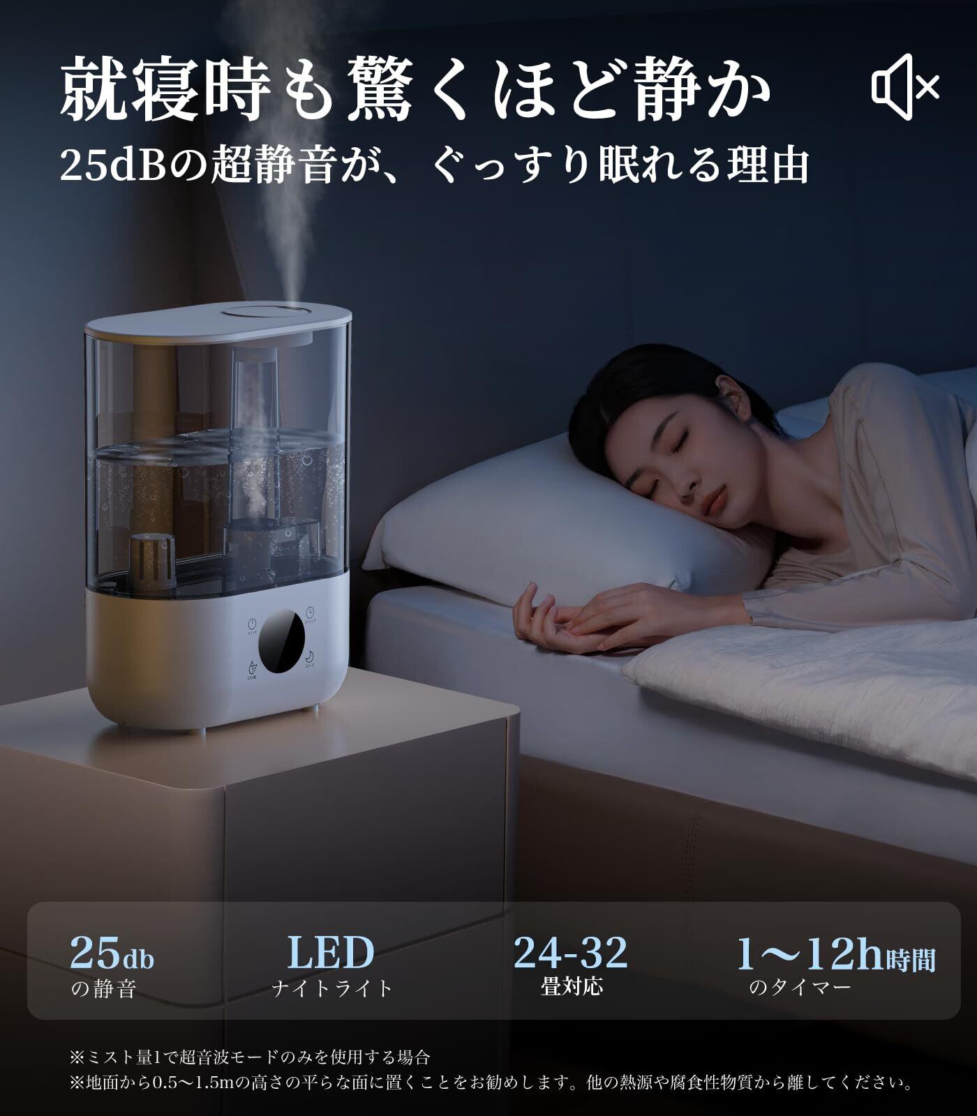 【超静音睡眠モード & 12時間タイマー& LEDナイトライト|安らぎの睡眠をサポート】就寝時もぐっすり眠れる超静音設計(約25dB)。おやすみモードにすると操作パネルの明かりが消え、ほとんど音が気にならない環境を実現。1時間単位で最大12時間までのタイマー設定が可能。タイミングよく運転を停止するので、節電とともに加湿のしすぎを防ぎます。"タイマー"ボタンを3秒長押しするとLEDナイトライトが点灯し、カラフルなナイトライトが自動的に色を変えます。