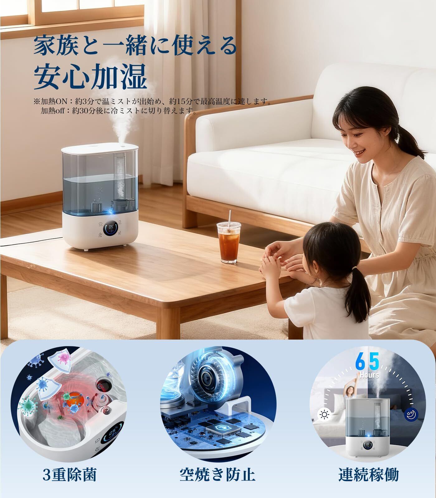 ️【2025新モデル|冷温2WAYのハイブリッド加湿器】超音波式と加熱式の組み合わせにより、加湿器は温かいミストも出せます。5μm以下の微細なミスト粒子がほこりを素早く沈殿させ、デスクや床を濡らす心配がありません。"ミスト量"を3秒間長押しすると、加熱機能がオンになり、最高温度は50度まで上がり、恒温加湿、効果的な除菌だけでなく、室温調整、空気浄化、肌の乾燥、花粉症や季節性鼻炎などの症状の改善にも役立ちます。※加熱モードをオンにしてから約3分後に温かいミストが出始め、約15分後に最高温度に達します。加熱モードをオフにしてから約30分後に冷たいミストに切り替わります 。