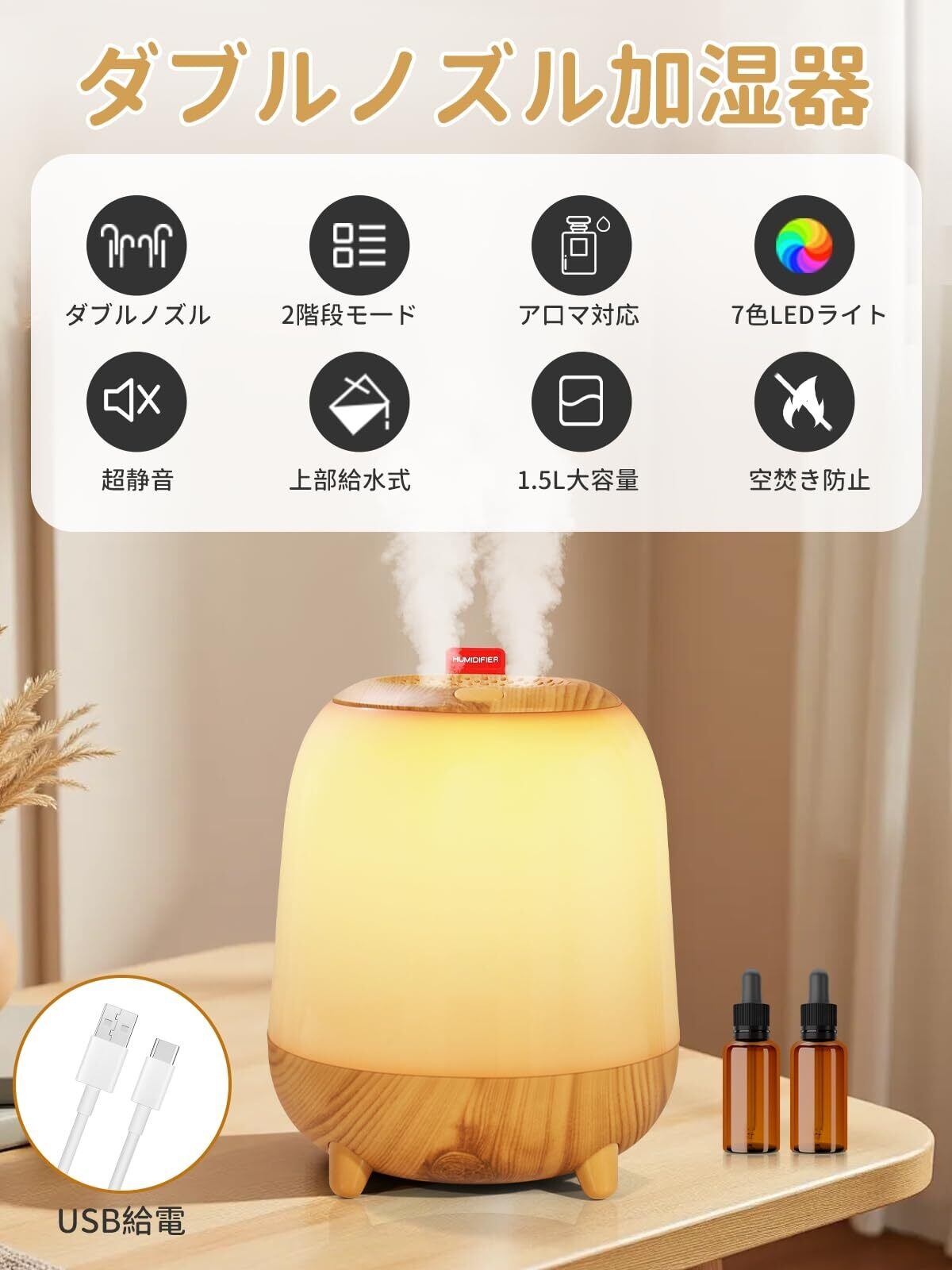 【数量限定】【2025新登場・木目調】加湿器 卓上 小型 1500ML 大容量 卓上加湿器 除菌 超音波式 次亜塩素酸水対応 アロマ対応 7色LEDライト 2段階ミスト ミクロンスプレー 6-10畳に対応 静音運転 省エネ 空焚き防止 24時間運転 8時間自動停止機能 USB給電 上から給水 お手入れ簡単 空気清浄機 乾燥/花粉症対策 寝室/部屋/オフィス用 クリスマス/誕生日/新年 プレゼント 説明書付き