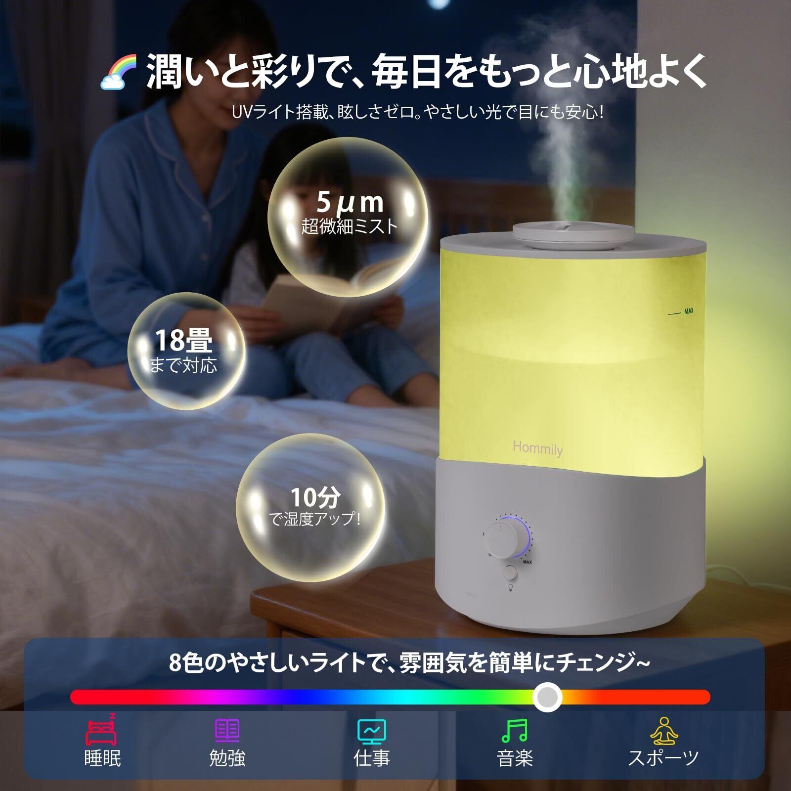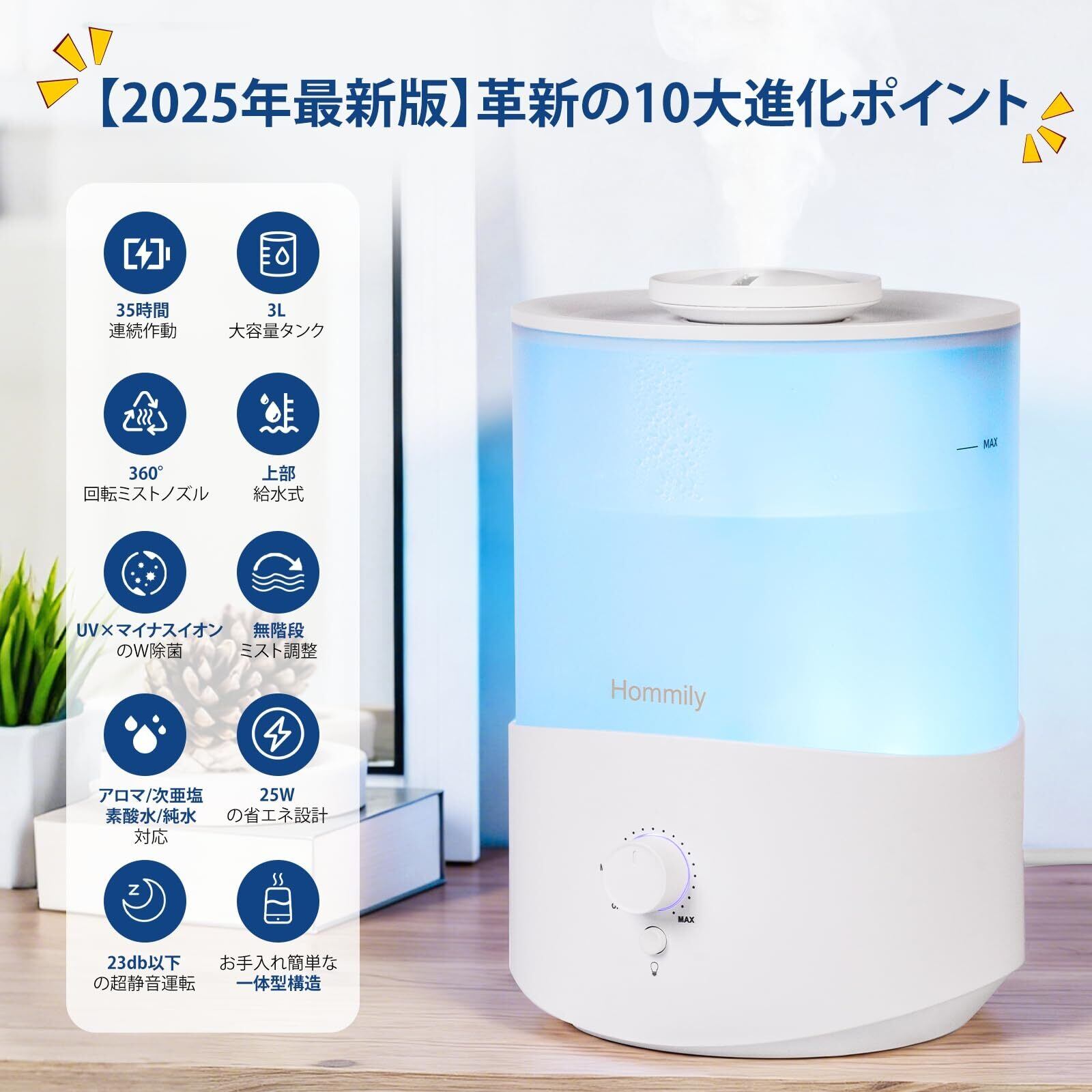 加湿器 大容量 3L【2025年最新 UV×マイナスイオンのダブル除菌&25W節電対策&360°吹出口&無階段ミスト調整】加湿器 卓上 超音波式 23dB静音 おしゃれ(アロマ/次亜塩素酸水/純水対応・空気清浄)上部給水・フィルター不要・簡単お手入れ 空焚き&水漏れ防止 8色LEDライト リビング/寝室/オフィス/会社/家庭 18畳まで対応 乾燥/花粉症対策 PSE認証済み(10012E)