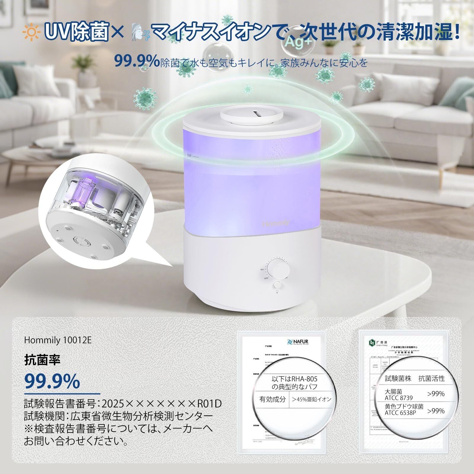 【UV除菌 × マイナスイオンで、家族みんなに安心の清潔加湿】 UVとマイナスイオンのW除菌で、空気も水も99.9%クリーンに。加湿器によるカビや菌の拡散を抑え、赤ちゃんや敏感な方にもやさしい安心設計です。毎分2,000万個のマイナスイオンが室内の空気をリフレッシュし、清潔で快適な湿度を維持。忙しい毎日でも手軽に健康な環境を守れ、家族全員が心地よく過ごせます。水も空気も徹底クリーン、これ一台で次世代の加湿生活を実現。さらに、試験報告書番号2025×××××××R01D(微生物分析検測センター)により効果が確認済み。忙しい日常でも手軽に健康環境を守れ、家族全員が清潔で心地よい暮らしを楽しめます。※イオン数値および除菌効果は使用環境により異なる場合があります。