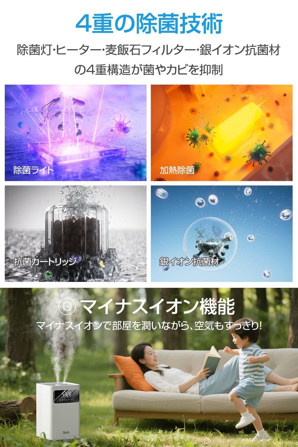 【4重徹底除菌&マイナスイオンで空気清浄】 加湿器のタンク内は、常に雑菌やカビが繁殖するリスクがあります。本品はこの課題を「4重除菌システム」で解決しました。①水を加熱して殺菌、②ライト、③抗菌効果のあるフィルターで微細な不純物をろ過、④タンク内部に銀イオン抗菌素材をコーティング。さらに、マイナスイオンを同時に放出し、部屋中のホコリや花粉、タバコの煙などの粒子を沈殿させ、空気そのものを浄化。寝室やヨガルームなど、空気の質にこだわる空間で真価を発揮します。