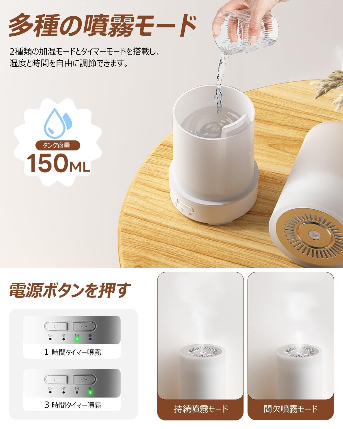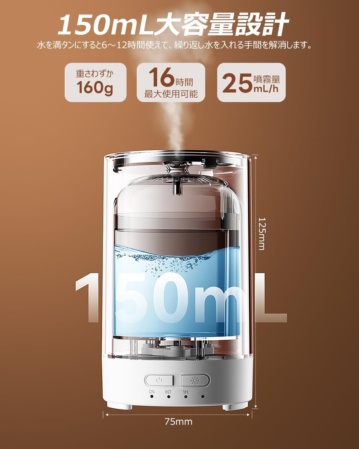 【2種類スチームモード・ 省エネ】高効率保湿で快適空間】2種類の加湿モードが調節できるため、部屋の湿度状況、ご使用の場面に応じての調整が可能です。ミスト量は25ml/h! 独自の超音波霧化技術を採用し、水分を微細な霧にして空気中に広がりやすく、部屋全体をしっかり保湿し、乾燥から守って快適な空間を作り出します。タンク容量は150mで、1回の給水で朝までお使いいただけます。運転中もタンクを外したりすることなく、タンク内の水がなくなると自動的に停止します。そのため、お出かけ中、就寝時などの長時間の使用でも空焚きをしてしまう心配がなく安心して使えます。消費電力の少ない超音波式でパワフル加湿と省エネを実現しています。