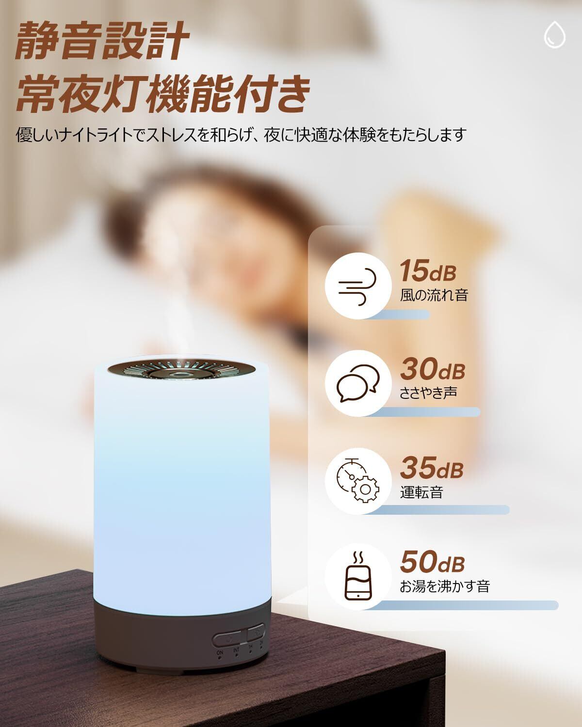 【超小型加湿器・静音運転】この超小型加湿器は、幅7.5cm・高さ12.5cmのコンパクトサイズです。コンパクトかつ軽量なため、持ち運びも簡単。寝室やオフィスはもちろん、車載加湿器としてドライブ中や通勤・通学の移動中にも、さらには旅行やアウトドアでも随時スマートに潤いを届けます。動作音は35dB以下で、図書館のように静か。書斎で勉強したり休憩したりするときに全く邪魔にならず、快適に過ごせます。このような静かな環境を作り出すことで、ユーザーは気軽に加湿を楽しめます。