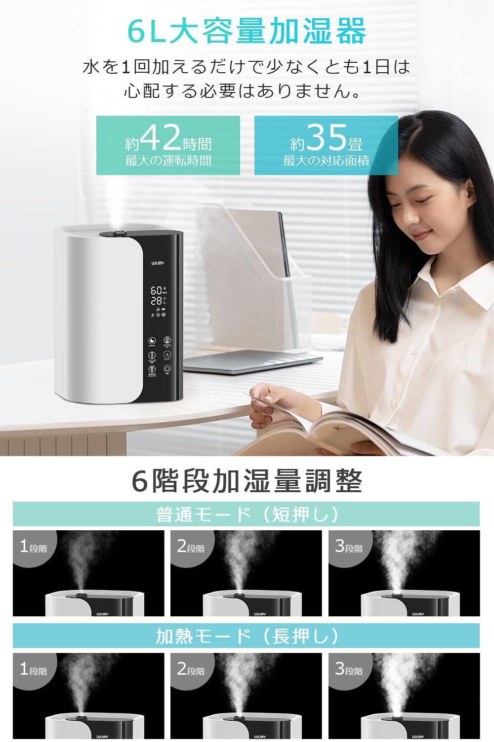 【6L大容量&6段階ミスト量調節&加熱式加湿器】6Lの大容量加湿器は、湿度を長時間保持します。加熱機能を選択すると、温かい霧が噴出され、より効果的な除菌が可能です。加湿量調節には合計6つの段階があり、加熱しない場合は3つの段階と加熱時の3つの段階があります。さらに、 加湿器 アロマ対応 !アロマトレイが内蔵され、好みなアロマオイルを垂らし、潤いとともに癒しの香りもお届けします。