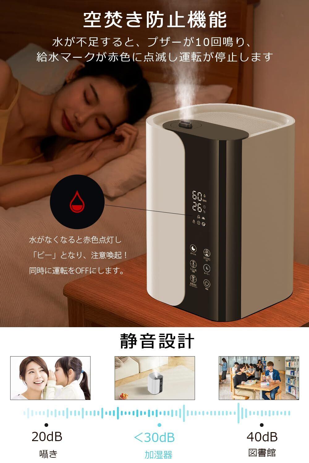 【12Hタイマー&静音&おやすみモードを搭載】より安心するために、寝る時に1〜12時間(1時間ごとに調整)切タイマーを設定できます。おやすみモードが搭載され、液晶ディスプレイの光も消灯されますので、眠りを妨げずに睡眠中も心地よくお部屋を加湿してくれます。