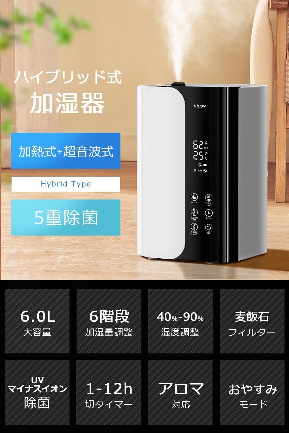 【2025年新登場・5重除菌・加熱式】加湿器 大容量 6L 超音波式 ハイブリッド式加湿器 卓上 100℃高温除菌 空気清浄機能 マイナスイオン アロマ対応 上から注水 UVライト 6段階加湿量 湿度調整/温度表示/チャイルドロック/12Hタイマー 静音 水漏れ防止 空焚き防止 省エネ 遠隔制御 リモコン付き 寝室/オフィス/家庭用 (ホワイト)