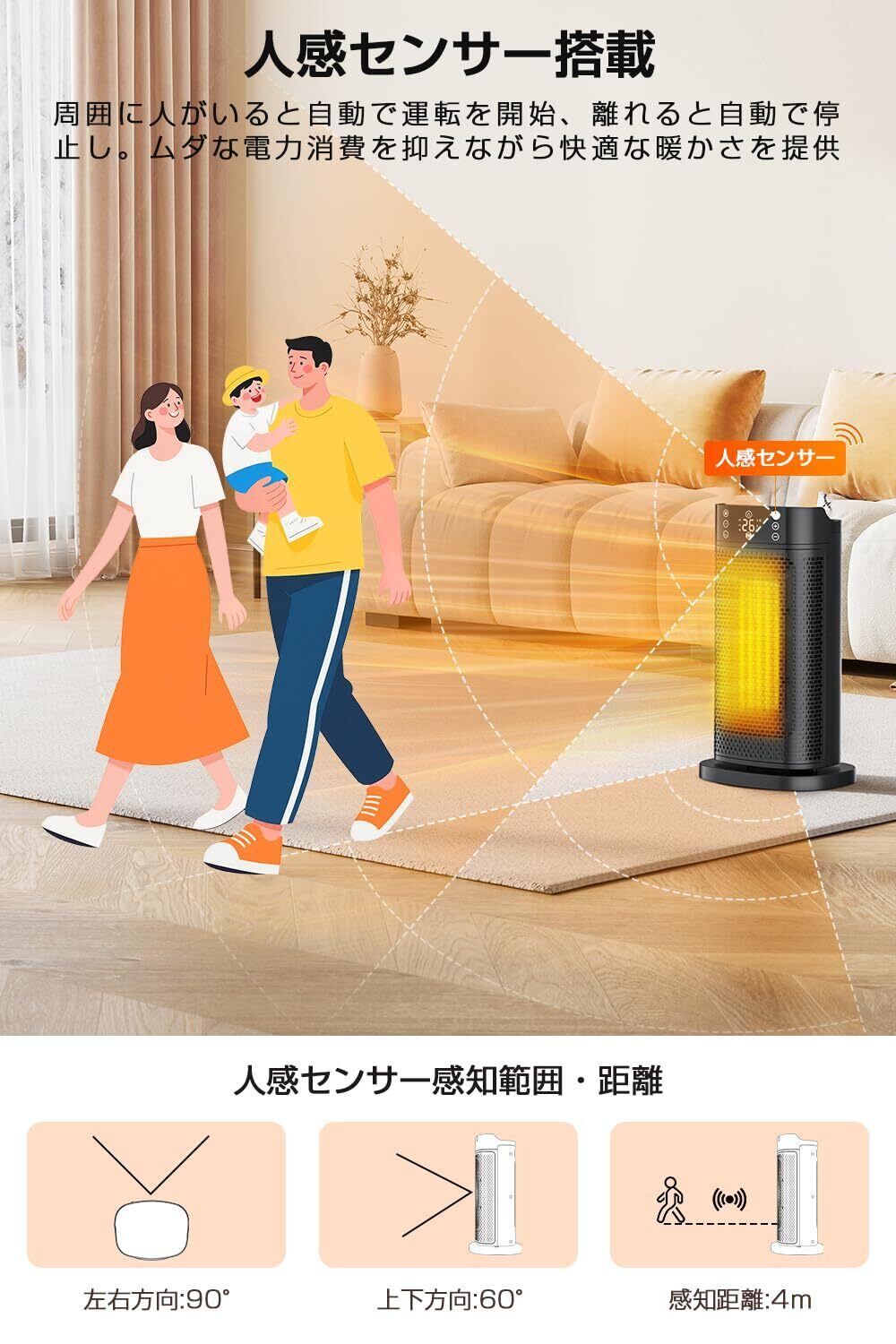 【人感センサー搭載 足元ヒーター・低騒音&節電設計】人を感知して自動でオン・オフできる人感センサー付きセラミックヒーター。無人時は自動で電源オフし、電力のムダを省いて省エネ効果を最大化。低騒音設計で夜間使用やオフィスでも快適。静かでパワフルな電気ファンヒーターとして一年中活用できます。