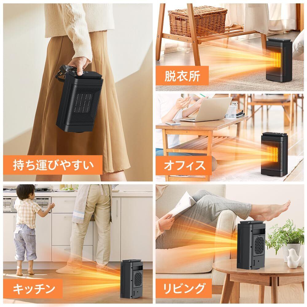 【低騒音設計・安全保護機能】静かな動作音で、寝室や勉強部屋でも安心して使える低騒音設計。読書や就寝中でもヒーター音が気にならず、穏やかな暖かさを届けます。また ミニストーブ 安全面も万全で、転倒時には自動で電源がオフになる「転倒自動OFF機能」と、過熱を感知すると動作を停止する「過熱防止機能」を搭載。さらに2〜12時間まで設定可能なタイマー機能付きで、外出前や就寝時にも安心。小さなお子様やペットのいるご家庭でも安全に使用できる、信頼性の高い冬の必需品 脱衣所セラミックヒーター です。