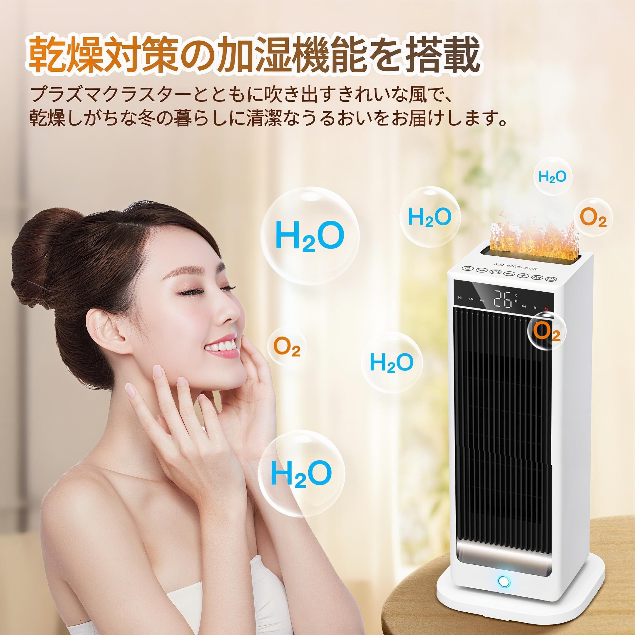 特徴 ①超音波加湿 ②人感センサー付き ③ECO知能モード ④90°自動首振り ⑤1~12時間タイマー ⑥安全ローク ⑦転倒自動オフ ⑧過熱保護 ⑨メモリー機能 ⑩リモコン付