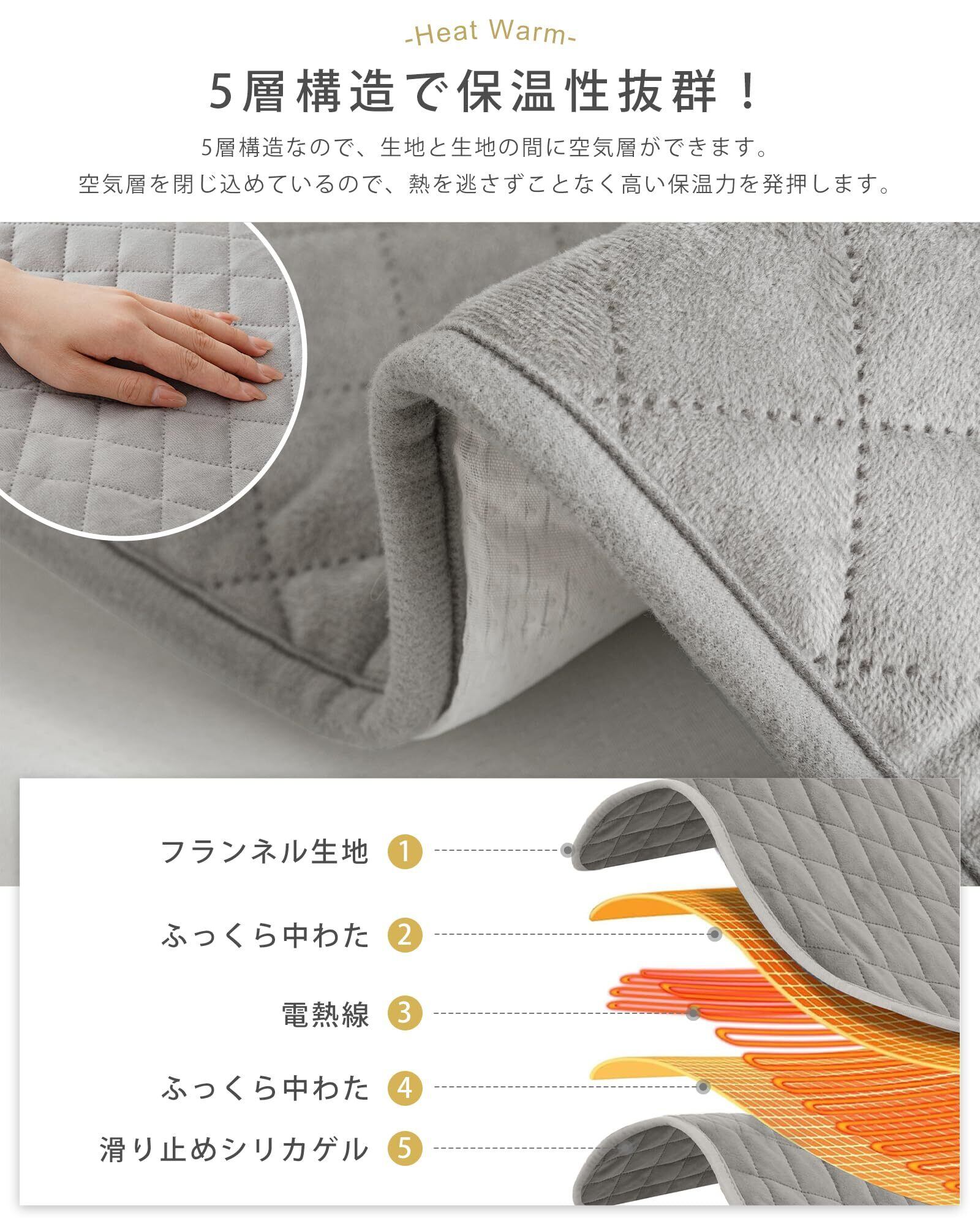 【触り心地良い&5層構造&操作簡単】柔らかく肌触りの良いフランネル素材を使用し、高級感のある仕上がり、上質な印象を与えます。5層構造なので、生地と生地の間に空気層ができます。空気層を閉じ込めているので、熱を逃さずことなく高い保温力を発押します。操作しやすいコントローラーなので、お子様からお年寄り方でも簡単に操作できます。