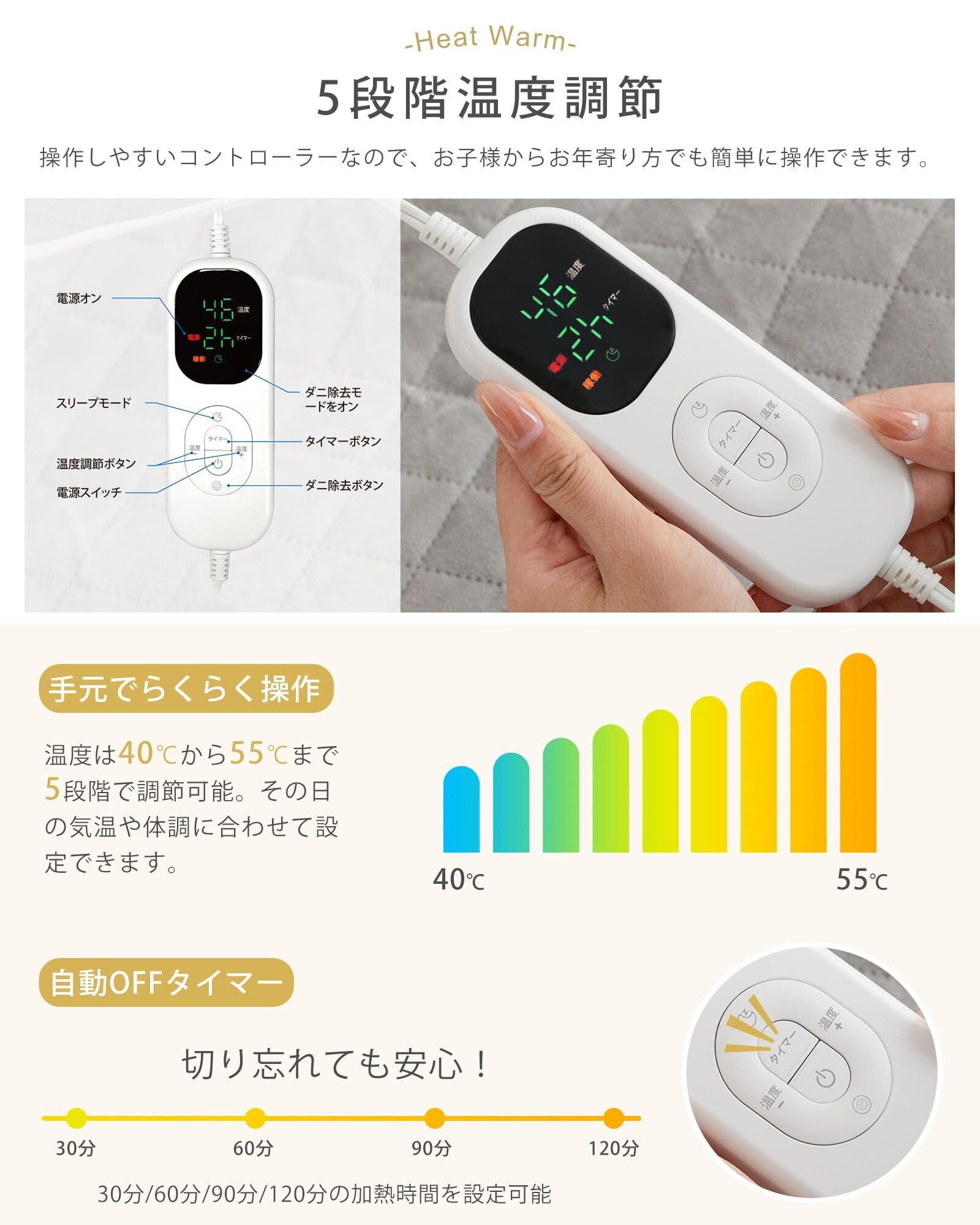 【5段階温度調整&タイマー機能】45℃~55℃の5段階で温度調整が可能です。室温や個人の体感温度に合わせて、最適な温度に設定できます。独自の配線構造により、部位ごとに最適な温度設定が可能。胸元から足元まで、ムラなく暖めます。保温効果が高く、快適な睡眠を促します。0.5/1/1.5/2時間、または2時間で自動OFFできるタイマー機能を搭載。過熱防止機能など、安全設計を施しており、安心してご利用いただけます。