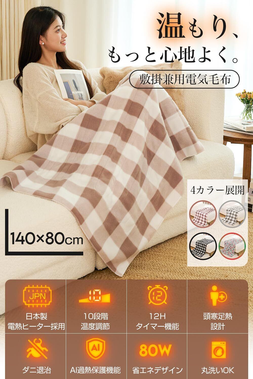 【在庫セール】電気毛布 掛け敷き兼用 【2025冬新モデル・AI過熱保護機 &12Hタイマー付き】 電気敷毛布 ひざ掛け 10段階温度 140×80cm 日本製ヒーター採用 60S速暖 省エネ 電磁波カット ダニ退治 肩掛け でんきもうふ 洗える 軽量 柔らか 暖房器具 冬のギフト 寒さ対策 自宅 オフィス キャンプ (ブラウン(チェック柄))