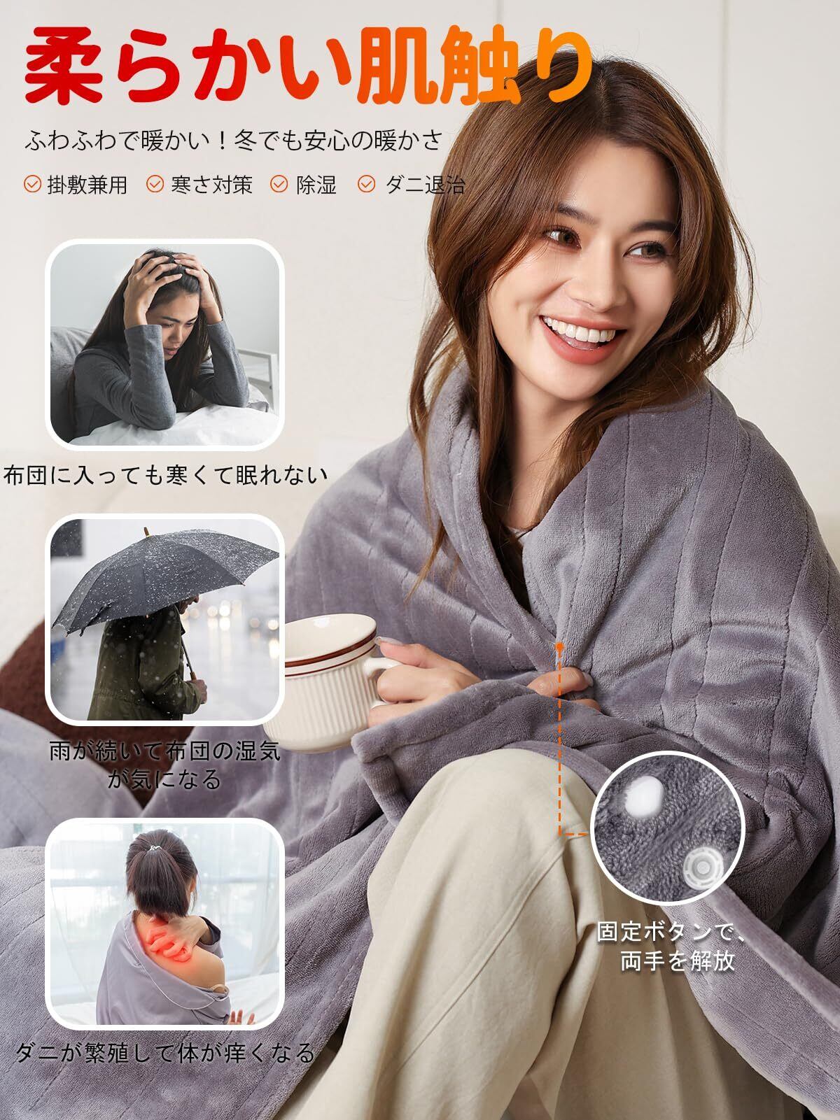 【掛け敷き兼用、リバーシブル 多用途】ひとつで2役を果たしてくれる電気毛布、敷き毛布と掛け毛布をそれぞれ購入する必要がありませんので、オフシーズンのときの収納も1枚分で済むため、省スペースで収まります。内側2箇所にボタンが付きまして、肩から掛けるのもできますので、上半身から温めると、全身がぽかぽかになります。動いてもずり落ちない設計で、ボタンを留めて外からの冷気をカットし、家事などにも邪魔しませんし、ソファに引きこもってテレビを見るときも使えます。