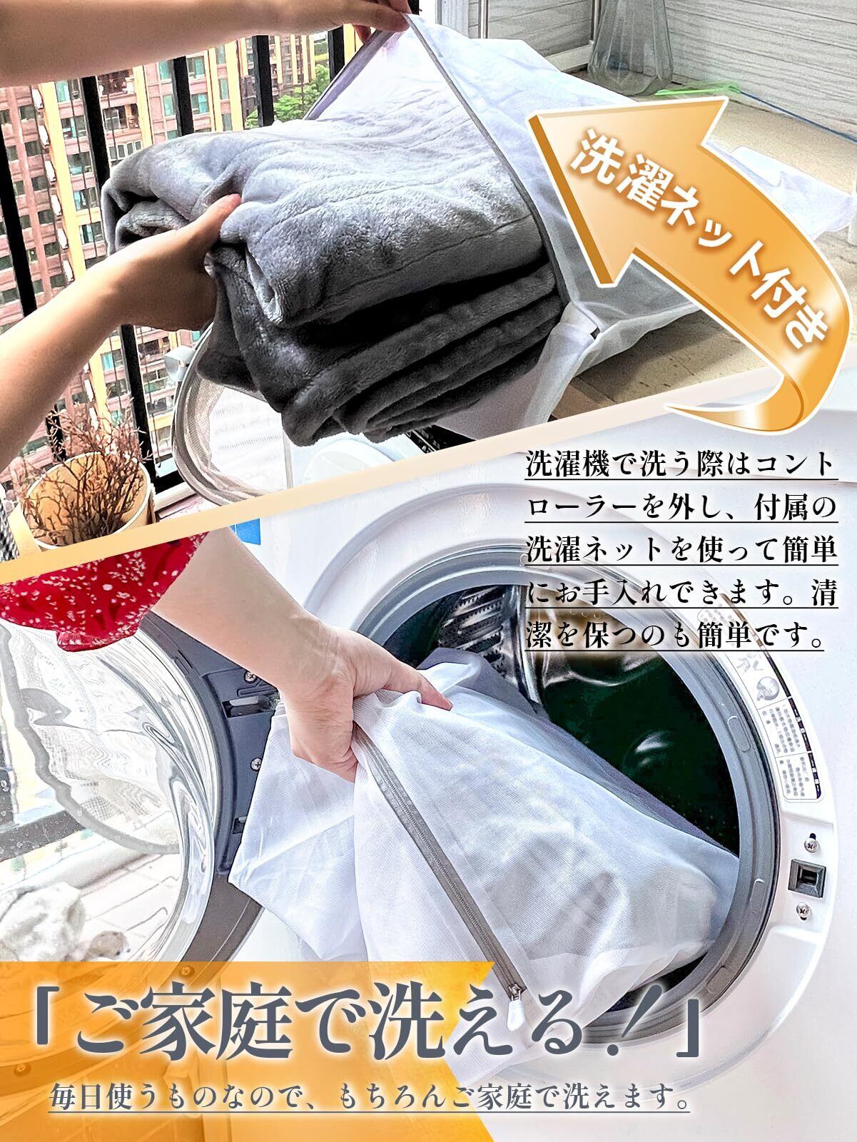 【フランネル素材+丸洗い可 衛生的に使える】厚みがあるフランネル素材は吸湿性や保温性とも影響します。吸湿性が高いことから汗をかいてもしっかりと吸ってくれます。体に掛け僅か10分で5℃以上も肌の表面温度が上昇するで、通電なしに使用しても出来ます。肌触りもサラッとして、静電気を帯び難い生地なので不快感を抱くことが少ないでしょう。リモコン部分を取り外せば洗濯機で丸洗いできるという洗濯後に乾燥させると縮まないのもメリットです。洗濯ネット付きで、寒い冬の洗濯がより簡単になります。