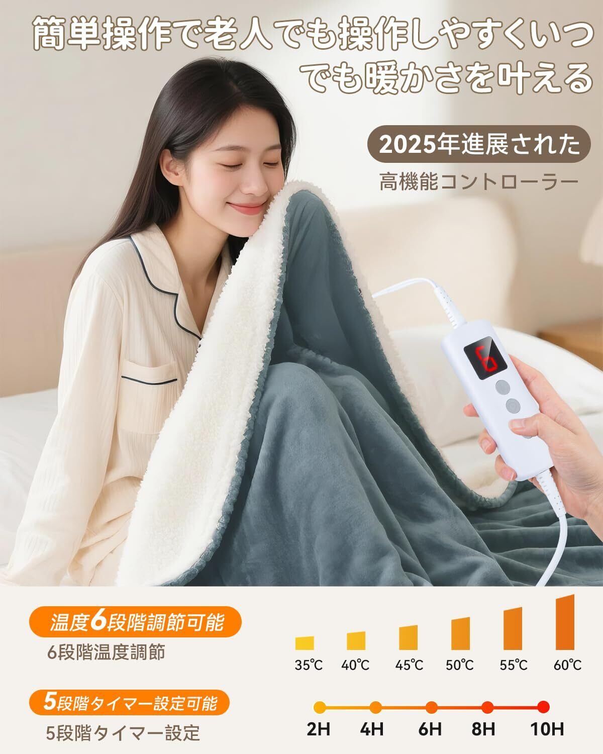 【操作しやすいコントローラー&5つタイマー&6つ温度モード&四重安全保護】電気ブランケットは従来品の3段階から大幅進化!「1(微温)~6(しっかり温め)」まで細かく調節可能、冷え性の方から暑がりな方まで、家族みんなの好みに合わせられます。2/4/6/8/10時間から選べる自動オフ機能を搭載し、「つけっぱなしで朝まで...」という心配なし!電気代の節約にも最適です。操作しやすいコントローラーは大きなボタンと明るい表示で、お年寄りでも迷わず操作できます。その上に、過電圧保護、過電流保護、短絡保護、過熱保護などもしっかり設定されますので、PSE認識済みで日常の使用はご安心ください。寒い季節に冷たくなった体や布団を温め、心地良い眠りをサポートします!「母の日に」「父の日に」「クリスマスの日に」「歳暮へ」プレゼントにも最適!