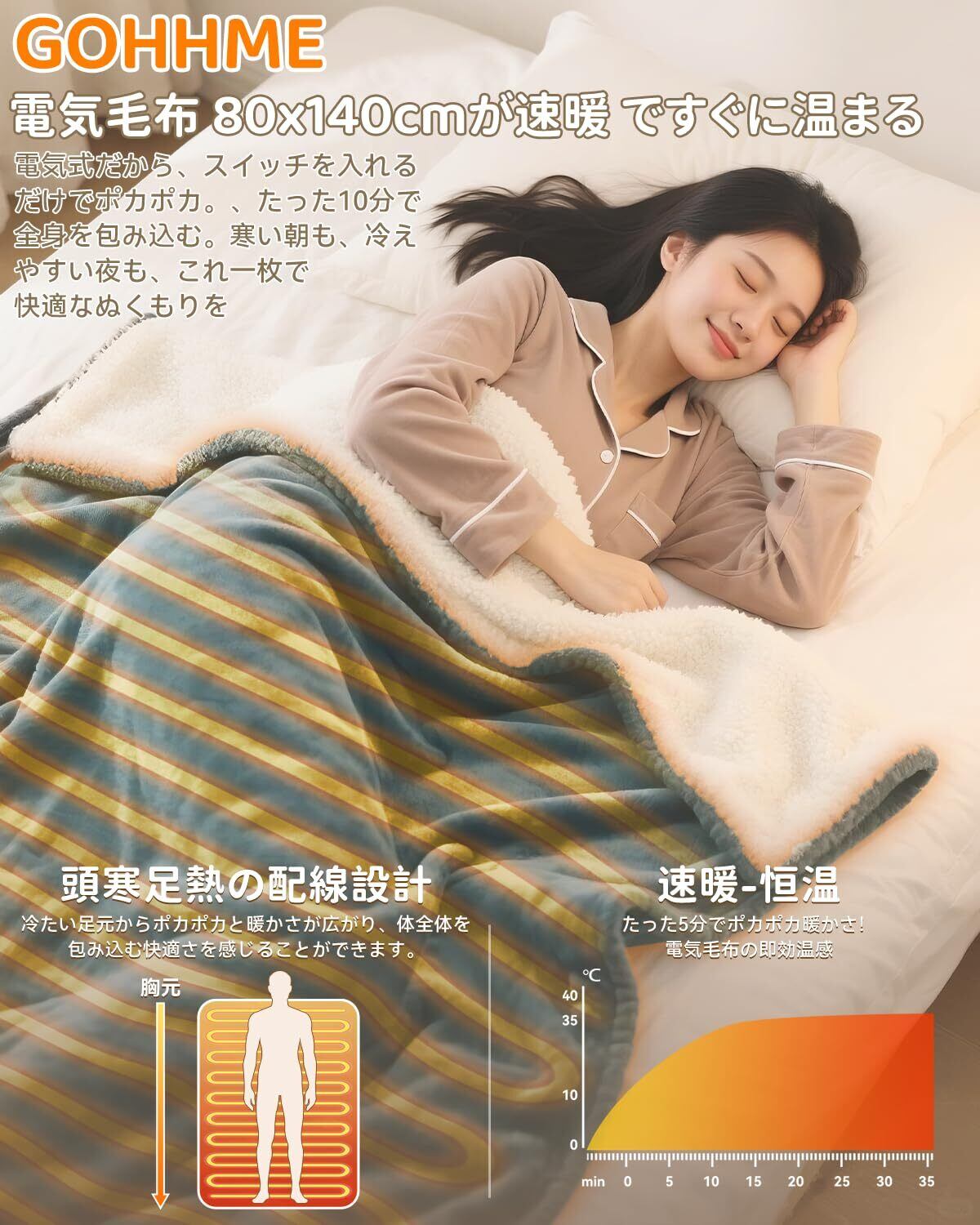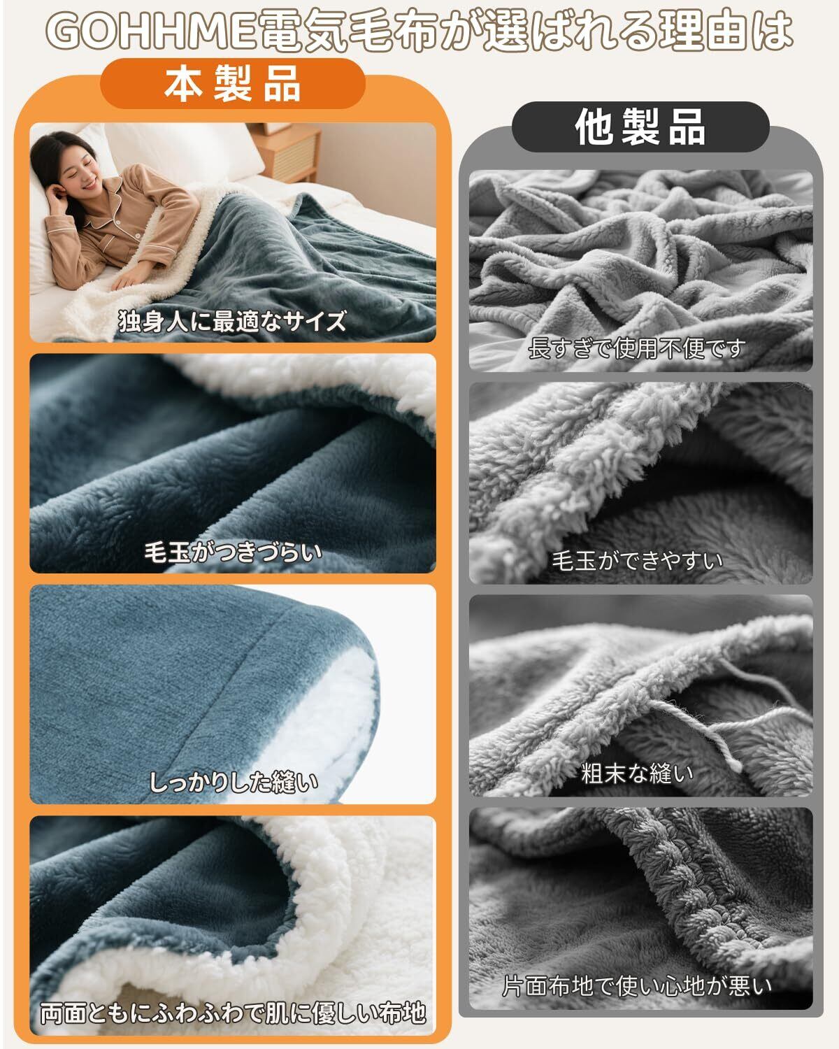 特徴 140×80cm一人サイズ, 掛け敷き兼用, 操作しやすいコントローラー, 省エネ&丸洗える, 高級両面使用可能仕様