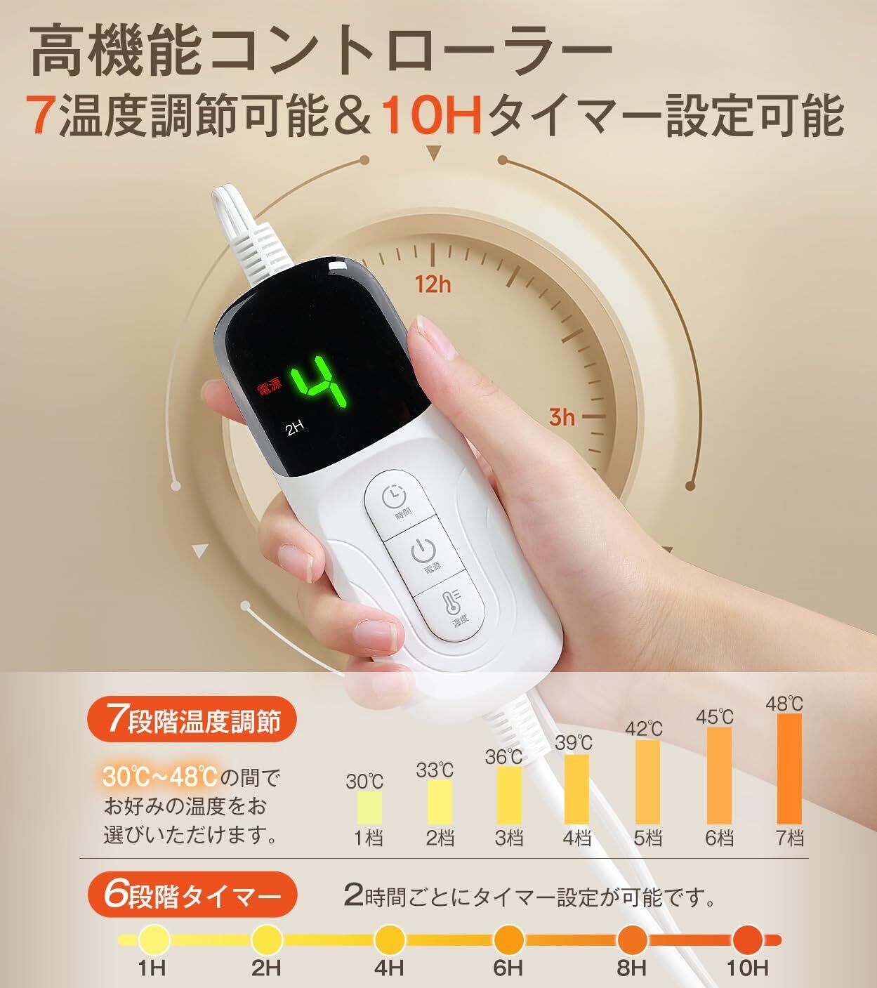 【7段階温度調整・1~10時間切りタイマー機能・省エネ性】電気ブランケットはled表示画面が付いたコントローラーを贅沢に配置、ボタンを押すだけで温度を30/33/36/39/42/45/48℃(個体差±3℃)7段階の範囲で調節できます。自分の体温や周りの気温に合わせて、快適な温度に設定できるのが特徴です。1/2/4/6/8/10Hのオフタイマー機能付き、付けっぱなしを防止可能です。タイマーが設定しない場合、2時間後自動に電源が切れます。使用時間を制限できるので、電気代の節約にもつながります。低温やけど・消し忘れによる事故を防止できるほか、切り忘れの心配も減らせるため、ご年配の方も安心して使用可能です。