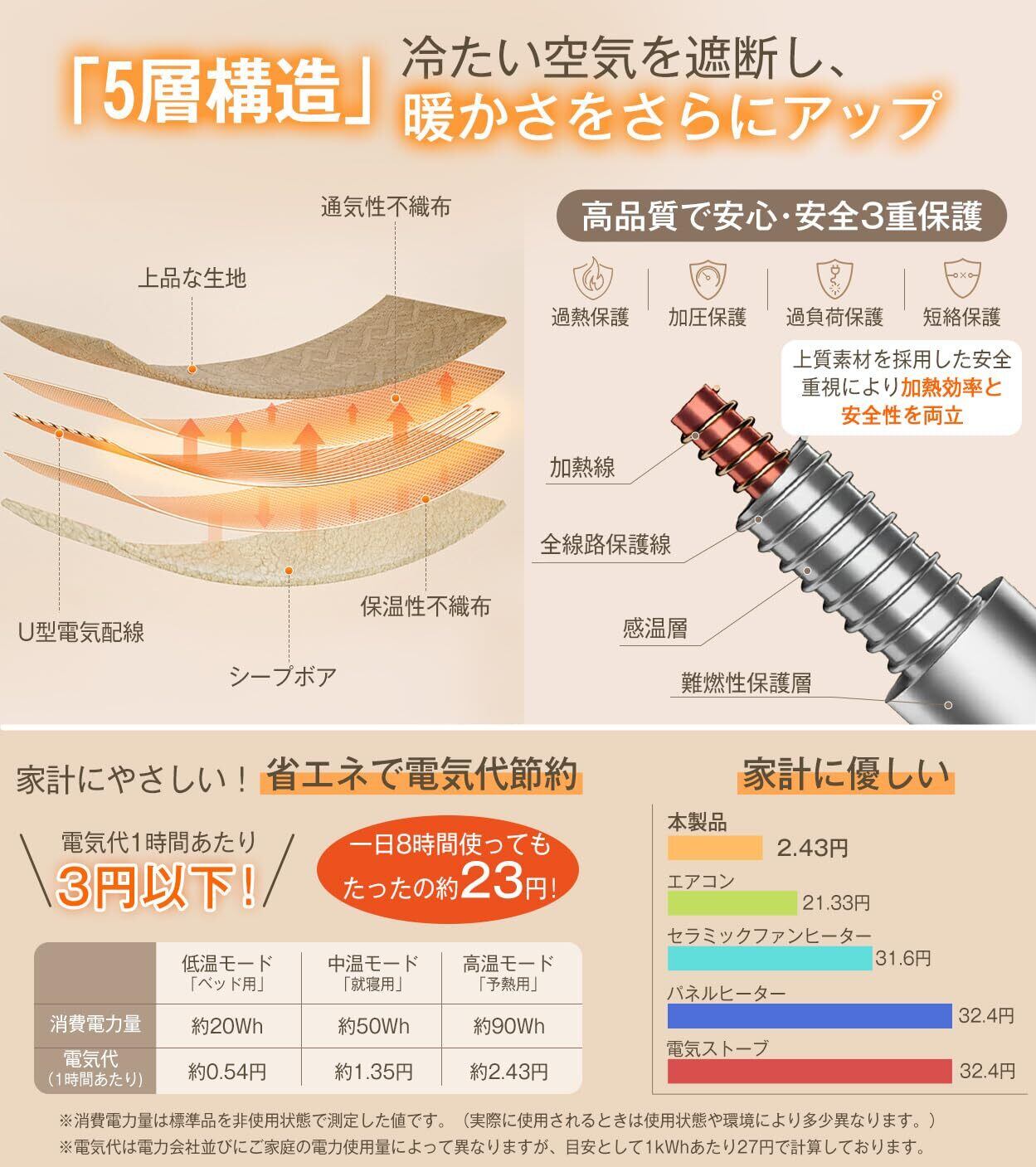 【頭寒足熱配線・PSE認証済みの正規品】電気ブランケットは就寝時に重宝する頭寒足熱配線を採用しており、冷たくなりがちな足元をしっかりあたため、胸元をソフトにあたためられます。そして、電気ブランケットが経済産業省認証機関による電気用品安全法の検査を通過し、安全基準を満たした認証(PSE)を取得!より安全性が向上しまして、安心にご使用いただけます。五層の安全構造及び過熱保護機能や均一加熱などにより、安心して心地よい睡眠をサポートします。また、過電圧保護、漏電保護、過負荷保護、短絡保護など、安全装置がしっかり備わっているので、万が一の時も安心です。