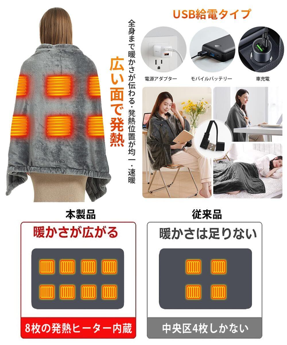 電気毛布 USB ブランケット 8枚の加熱エリア 150cmx80cm フランネル素材 ファスナー付き 3段階温度調整 省エネ 肩掛け 膝掛け オフィス アウトドア泊用 車中泊 洗える 防寒対策 暖房器具 (グレー 150x80cm)