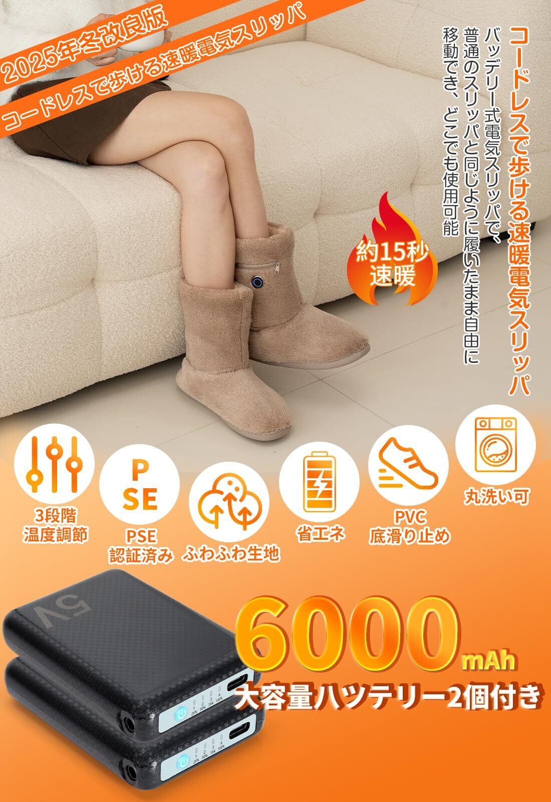 【2025年最新モデル!コードレスで自由に動ける電気スリッパ】バッテリーをスリッパ本体にすっきり収納。コードが絡む心配もなく、家中をストレスフリーに歩ける快適さを実感できます。おしゃれなミドル丈ブーツ型の足温器は足先からふくらはぎまでやさしく包み込み、極細繊維が空気をたっぷり含んで高い保温力を発揮します。片足わずか約210g(バッテリー除く)の超軽量設計で、長時間歩いても疲れにくい!さらに、お客様の声をお応えして、バッテリー位置をサイドへ変更することで足への負担を大幅軽減しました。キッチンでの料理やオフィス移動、在宅ワーク、テレビ鑑賞、家事など、様々なシーンで足元を快適に保温します。