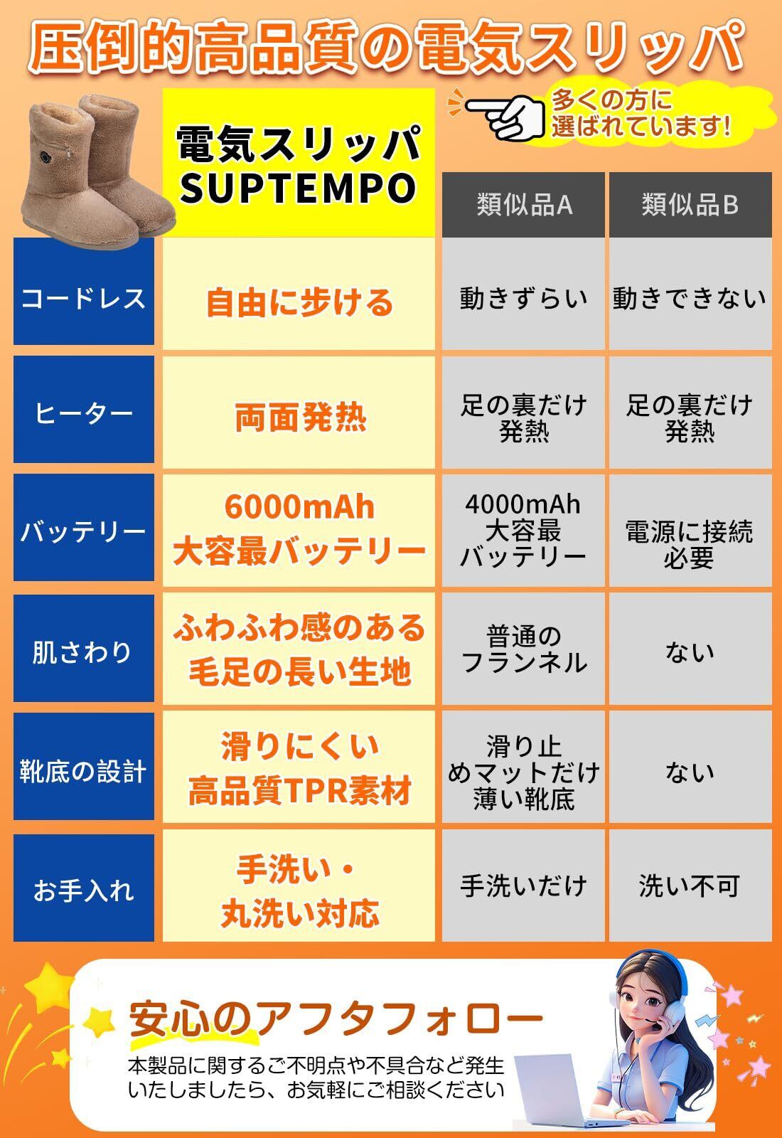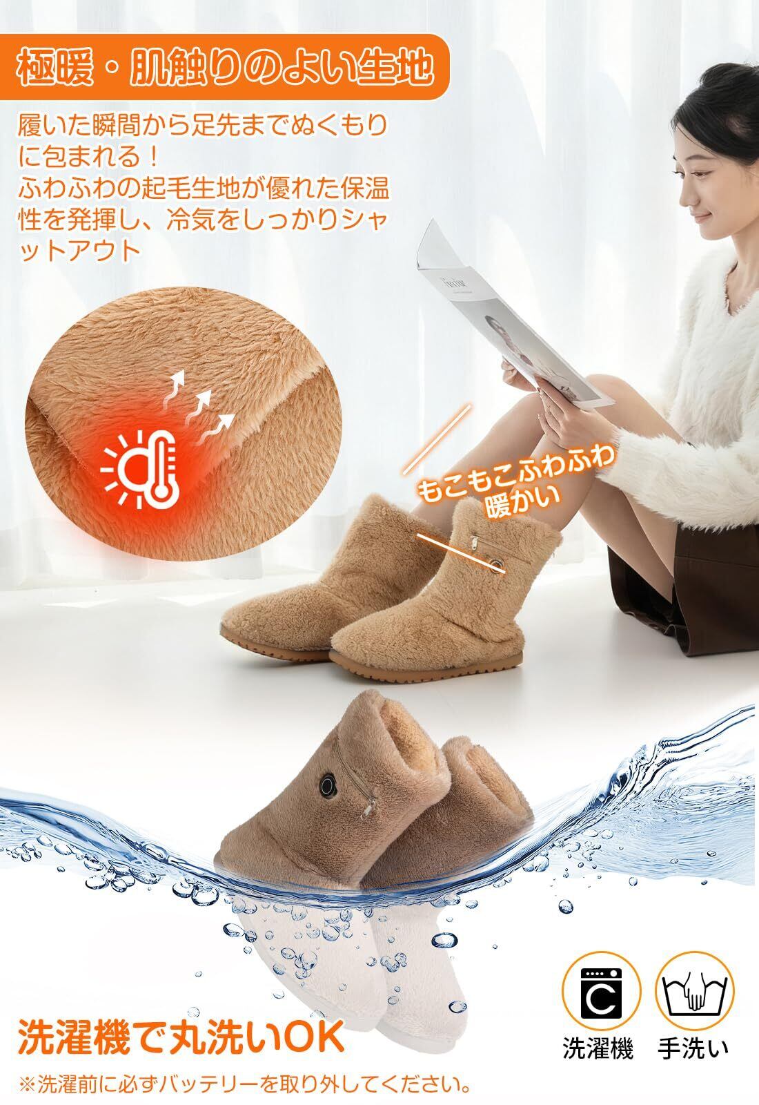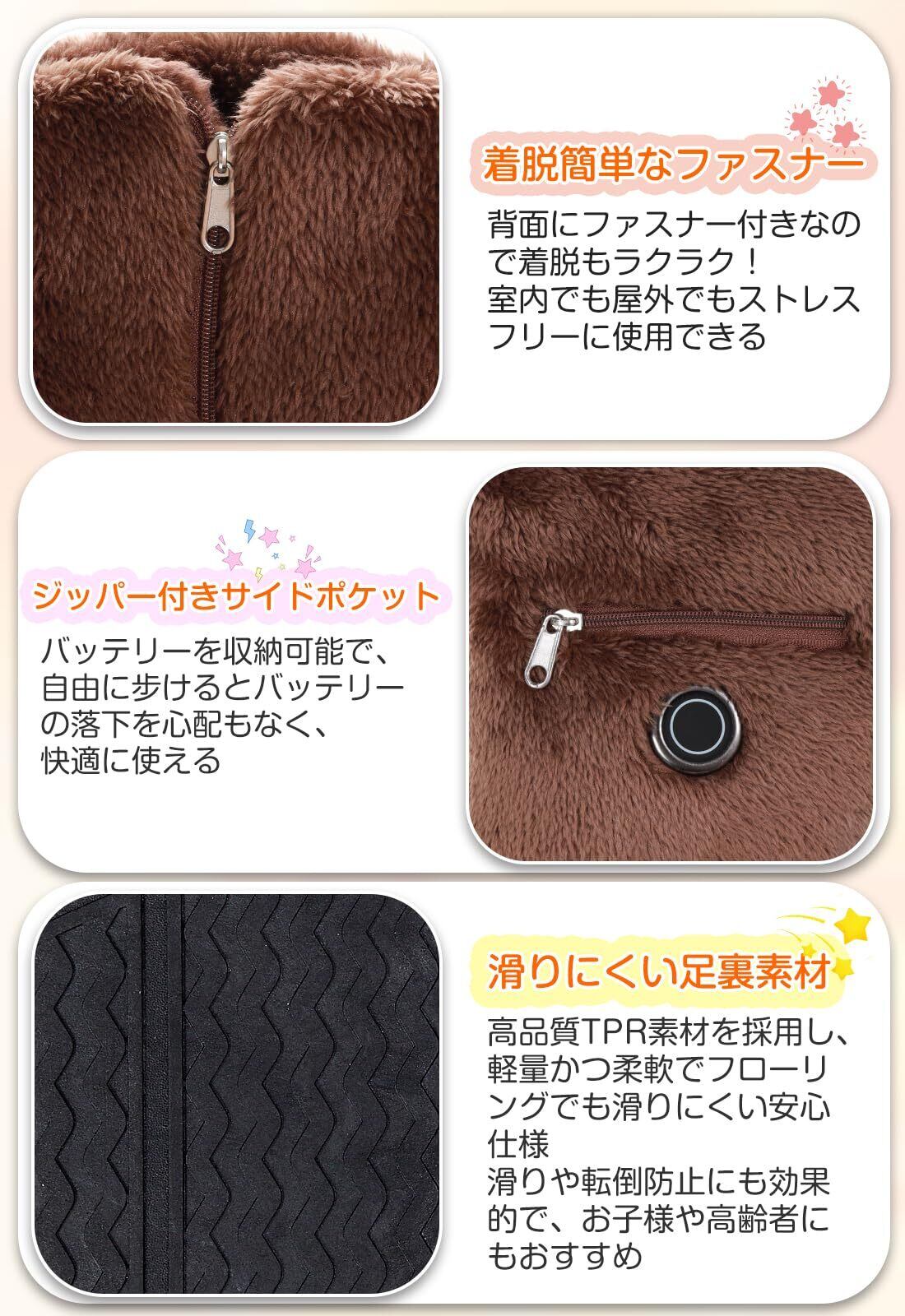 【肌ざわりの良い素材&滑り止め設計】フットウォーマーの表地はウサギのようにふんわりしなやかで、ずっと触れていたくなる心地よさです。裏地は厚手の起毛加工で、暖かさを逃さず、優れた快適性と保温性を実現しています。バッテリーを使わなくても厳冬の屋外でしっかり暖かさをキープします。歩ける電気スリッパの靴底は滑り止め加工されたTPR素材で衝撃を吸収し、床にパタパタと貼り付く音もなく、とても静音で歩きやすいです。さらに、履き口はゆったり設計&バックファスナー付きだからサッと脱ぎ履きラクラク!ジッパー付きバッテリーポケットで、足の動きによるバッテリーが落ちる心配はありません。