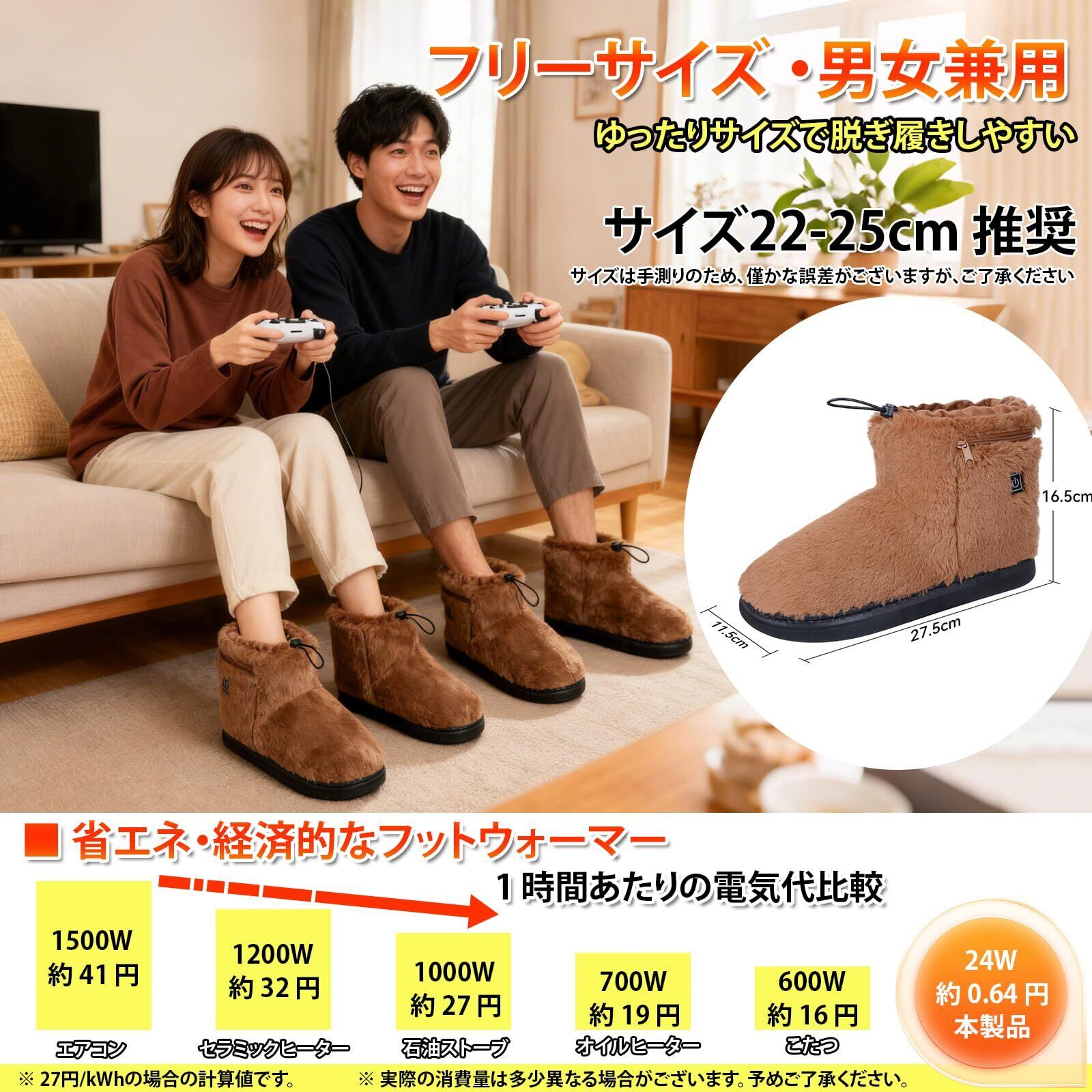 【省エネ|経済的、冬のあらゆる場面で活躍】:消費電力21Wで、他の暖房器具に比べて、省エネで経済的。1時間あたりの標準電気代目安は1円未満と、経済的で電気料金がかかりにくい省エネ設計。月に30日、毎日8 時間使用しても約144円で済み、冬の家計を大幅に節約できます。「暖かくしたいけど電気代が心配」という人に最適です。掃除をしたりするとき、自転車や電動自転車での通勤・通学とき、コードレスなので自由に動けて便利です。デスクワーク中に足元を温め、勉強や作業に集中できます。仕事の効率性向上やスピードアップが期待できます。従来品の「部分発熱」を超える全面発熱マットを内蔵、足底のに温め、冷え性改善を促進します。足元の寒さは全身の疲れや不快感につながりがちです。特に高齢の方や冷え性の女性、長時間室内で仕事をする人には特におすすめです。クリスマス、元日、初詣、新年会、冬の寒い日に最適な贈り物です。
