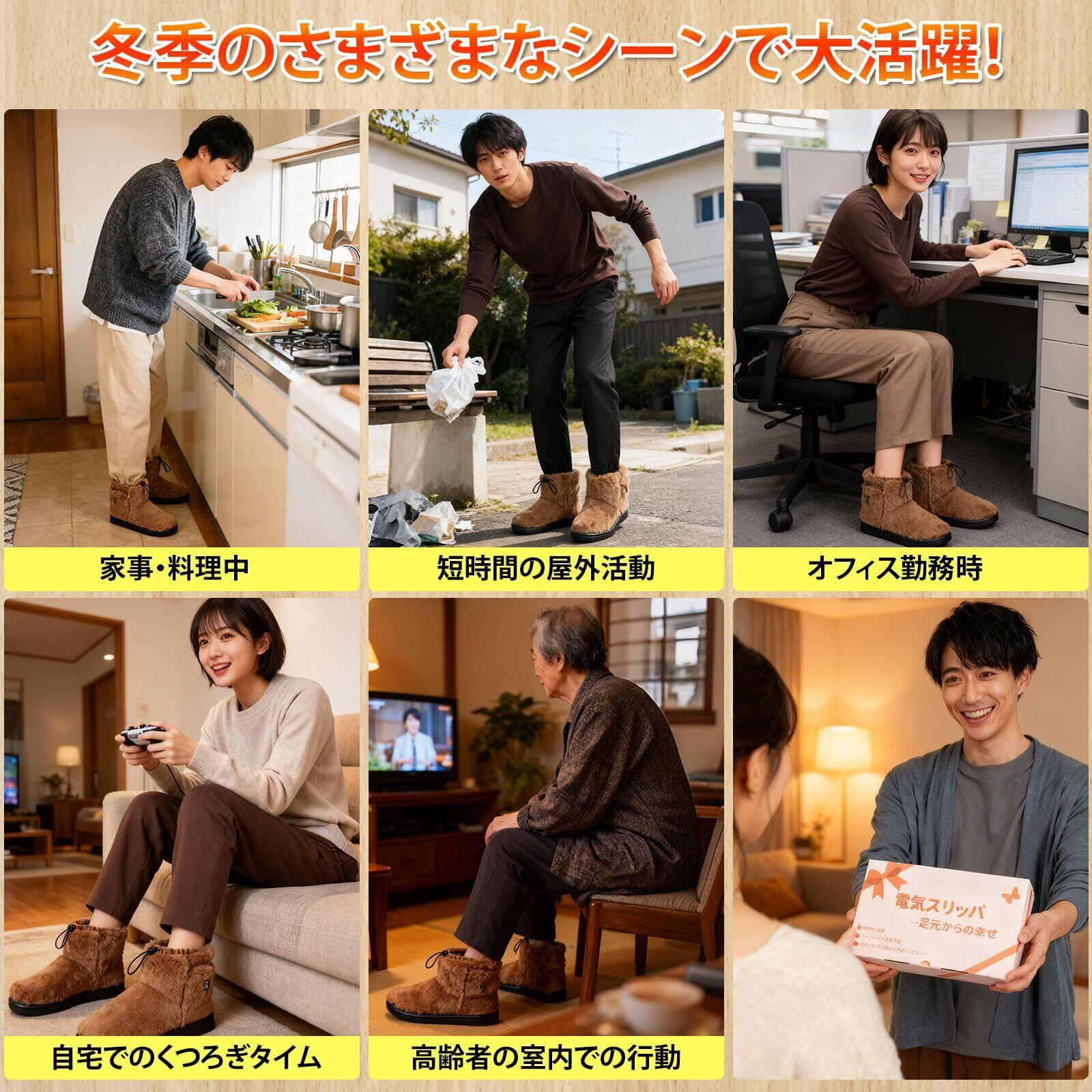 【足裏全体から足首まで、隙のない保温設計】2025 最新電気スリッパは、靴底全体に均一な発熱構造を採用し、60秒で速やかに暖かさを実感できます。約15cmの高さが足元から足首までしっかり包み込み、鞋口の収納ロープで熱の逃げを防ぎ、ぽかぽかとした暖かさを長時間維持します。足裏全体が温まることで、床からの冷気をしっかり遮断し、足冷え症を効果的に緩和します。約28×12cmのサイズで、窮屈感なく着用でき、男女兼用のデザインで夫婦や家族で共有することも可能です。日常生活のさまざまな場面で、暖かさを楽しみながら安全に使い続けられるよう設計されています。寒い季節の足元の冷えや、末端冷え性の悩みをしっかりサポートします。気軽に電気足温器を使用しており、寒い冬を快適に過ごしましょう!