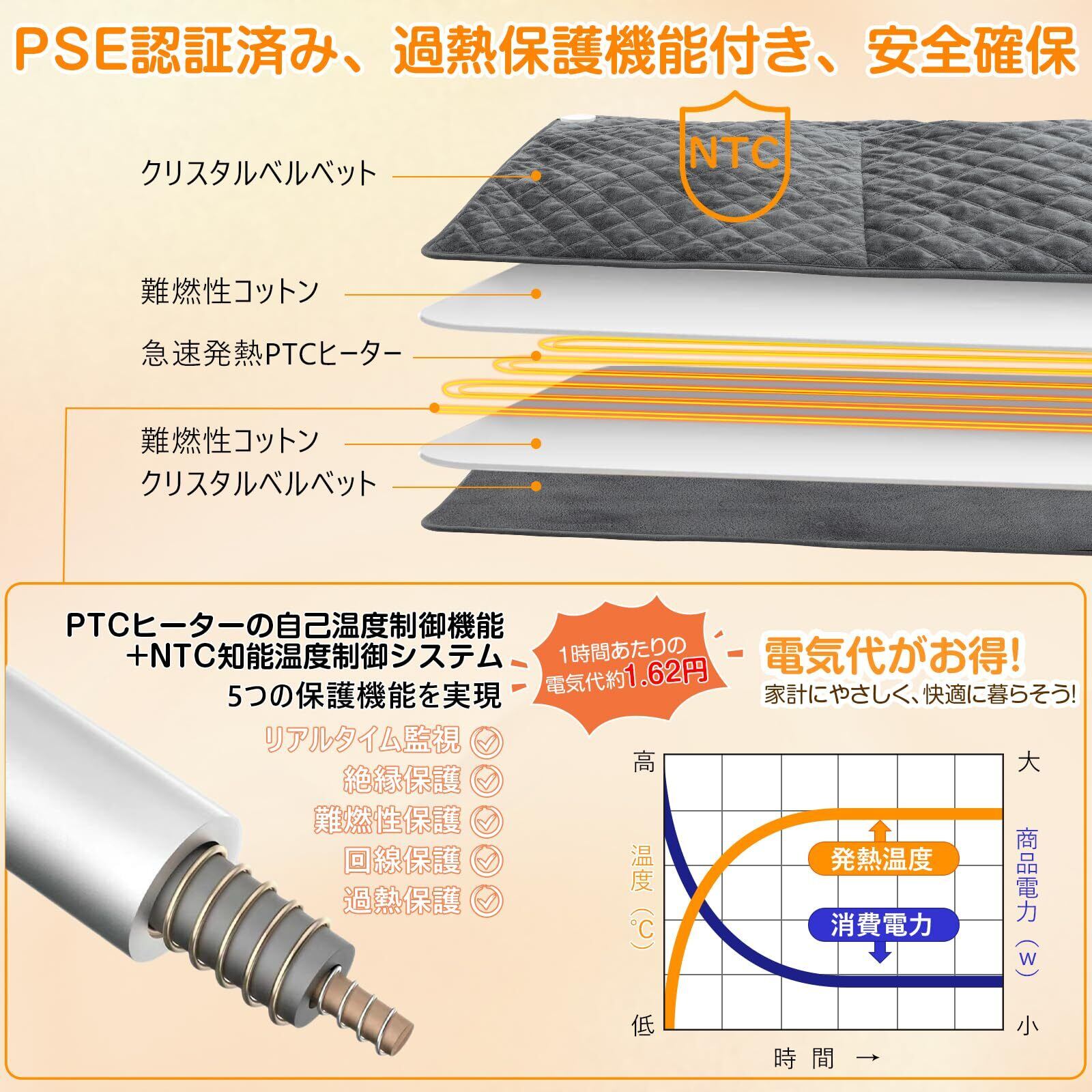 【安全保護設計&省エネ】足元電熱カーペットは、五重構造を持つ日本製PTCヒーターを採用しており、リアルタイム監視、絶縁保護、難燃性保護、回線保護、過熱保護の5つの保護機能があり、PSE認証済みで、安全確保します。PTCヒーターの自己温度制御機能と、NTC知能温度制御システムとを組み合わせ、過熱や電圧異常の場合、自動的に電源を切り、火事や過度の加熱による火傷を防ぎます。1時間あたりの電気代は約1.62円(27円/kWhで計算)で、省エネでお金の節約、コスパには最高です。