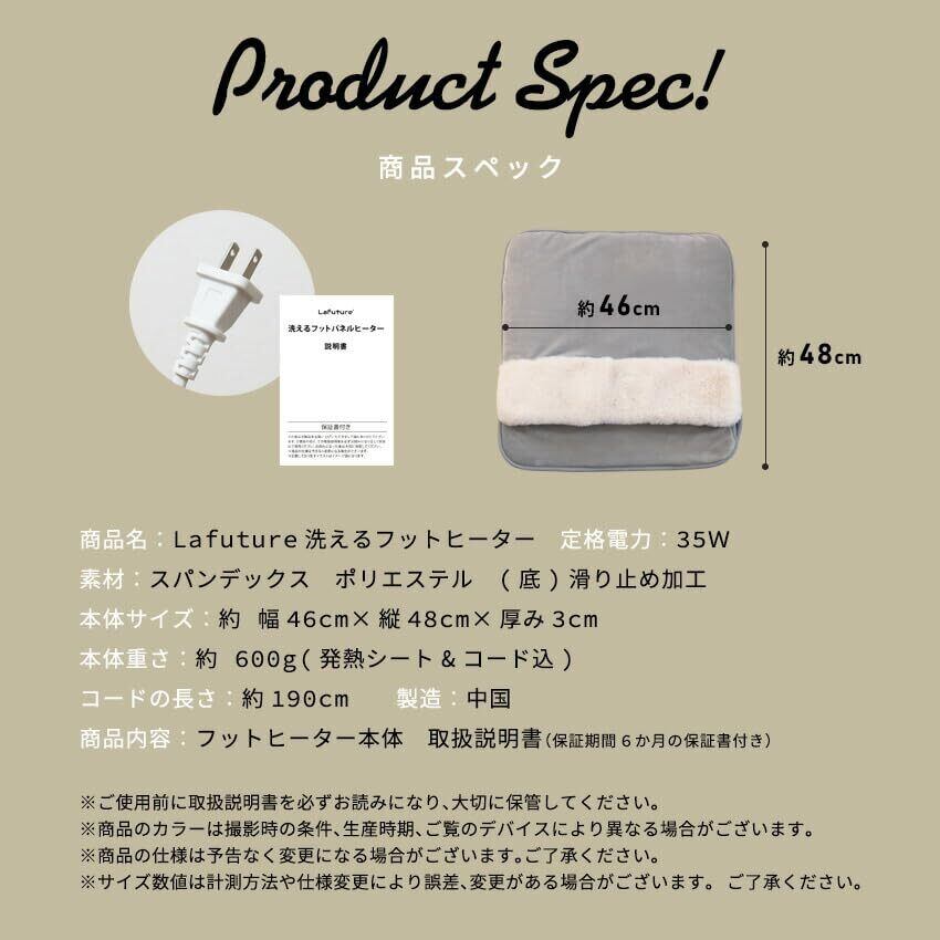 【商品詳細】定格電圧:35W カバー素材:スパンデックス ポリエステル (底)滑り止め加工 本体サイズ:約幅46xm×縦48cm×厚み3cm 本体重さ:約600g(発熱シート&コード込み) コードの長さ:約190cm 商品内容:フットヒーター本体 取扱説明書*ご使用前に取扱説明書を必ずお読みになり、大切に保管してください。*商品のカラーは撮影時の条件、生産時期、ご覧のデバイスにより異なります。*商品の仕様は予告なく変更になる場合がございます。ご了承ください。*サイズ数値は計測方法や仕様変更により誤差、変更がある場合がございます。ご了承ください。