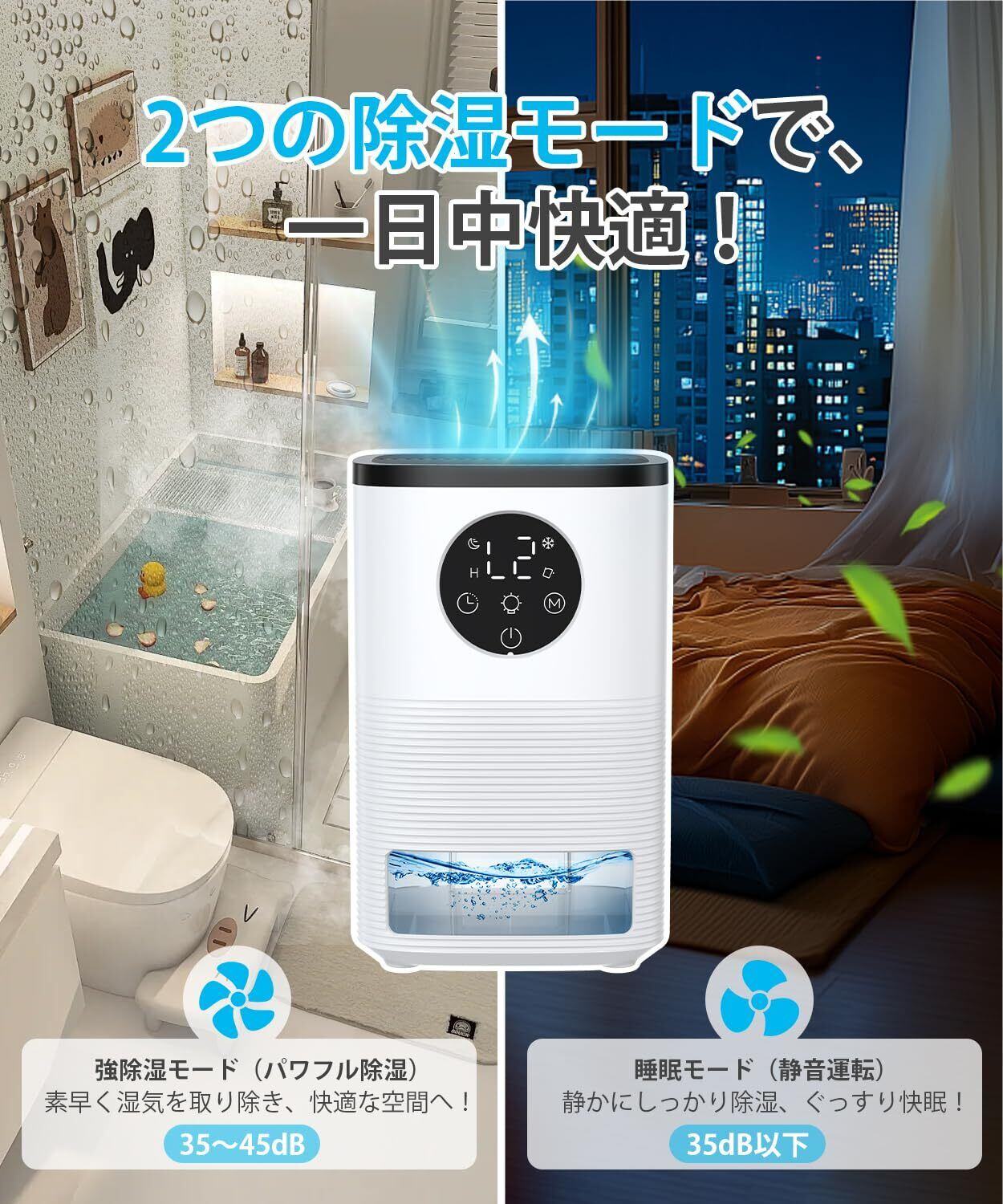 【直感的操作・2つの除湿モード】この除湿機は大画面タッチパネル搭載で、操作が直感的で簡単。ボタン押下時にブザー音で操作確認が可能、使いやすさを追求。強除湿モードと睡眠モードの2つの除湿モードを搭載。強除湿モードでは高出力で素早く除湿、睡眠モードでは低騒音運転で快適な睡眠環境を確保。どちらのモードも簡単に切り替えられ、お好みの除湿環境を作り出せます。