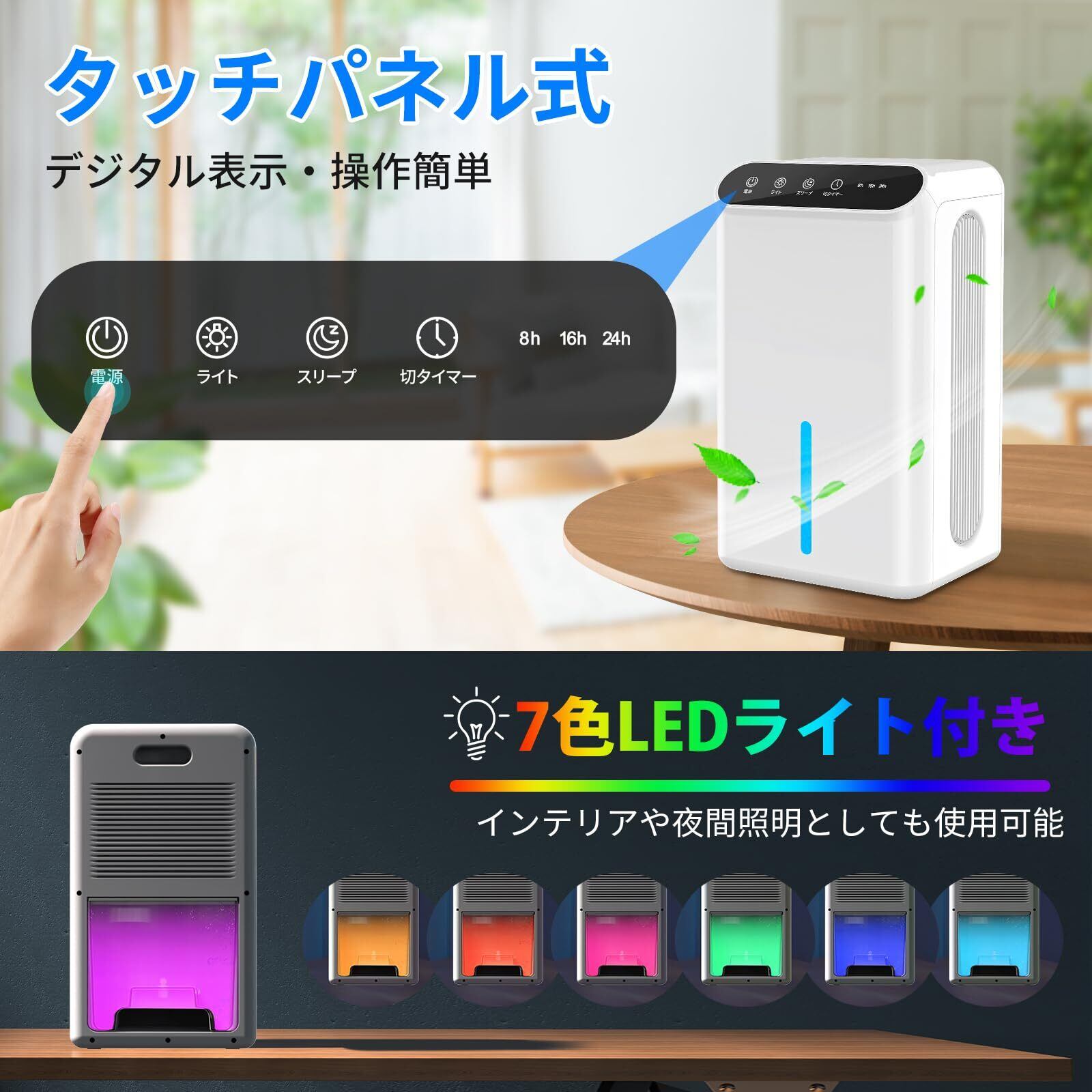【高級感たっぷりディスプレイ&7色雰囲気ライト】Dawncom 除湿機はタッチセンサー式の操作パネルを採用し、強い力を必要とせず指で0.1秒位軽く触れるだけで簡単に操作可能、かつ、高級感溢れる大画面液晶ディスプレイも搭載しており、タイマー機能などじょしつきの運転状態が一目で確認できます。さらに、七色雰囲気LEDライト付きで、インテリアや夜間照明としても使用が可能です。起動しているときにLEDライトが点灯するタイプは、ベッドサイドのランプとして使用できるので寝室で使用したい人にぴったりです。