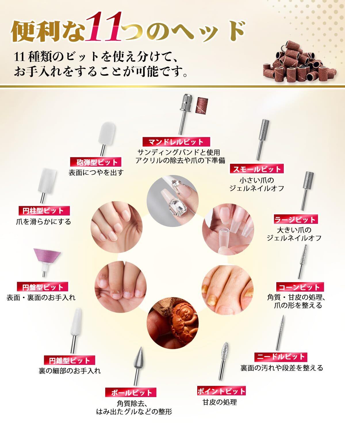 【9 段階速度調整&プロ級研磨 2 機能設計】9 段階の精密速度調整システムを搭載し、爪の厚さやケアニーズに応じて回転数を柔軟に調整可能です。初心者向けのやさしい研磨からプロ向けの精密な仕上げまで対応し、過度な切削を効果的に防ぎます。さらに、粗研磨、細研磨、ポリッシュ、形状調整などの機能を持つ 27 個の砥石アクセサリーを同梱し、ネイルケアの前準備、メイン作業、後始末まで一連の工程を 1 台で完了でき、追加工具は不要です。