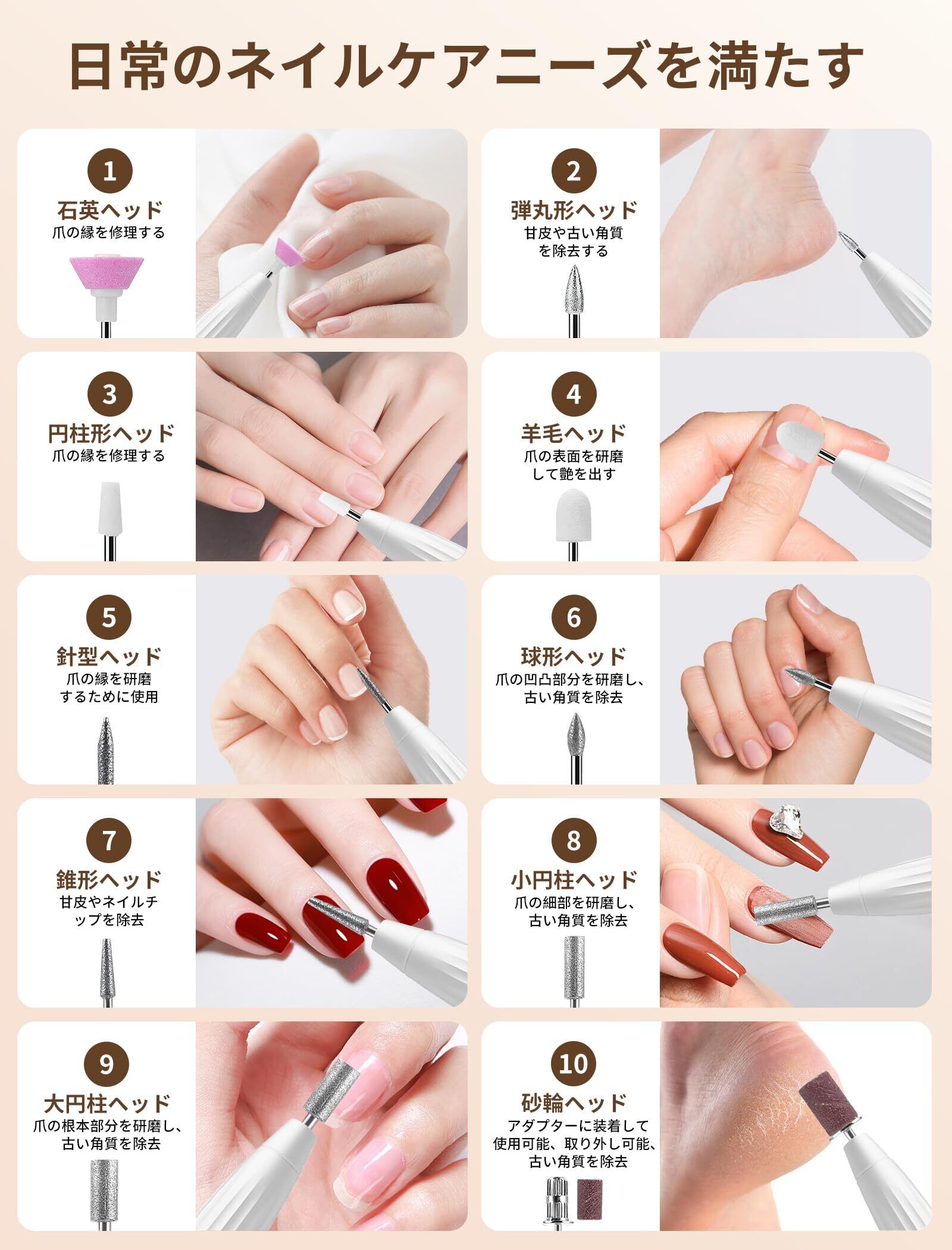 【1 台で 10 種機能を実現】11 点セット(10 ドリル同梱)ジェル除去、甘皮処理、角質取り、爪磨きなど、多様なネイルケアシーンに幅広く対応。細かな処理から大まかな整備まで使い分け自在で、ドリル交換も簡単だから、初心者でも手軽に操作できます。