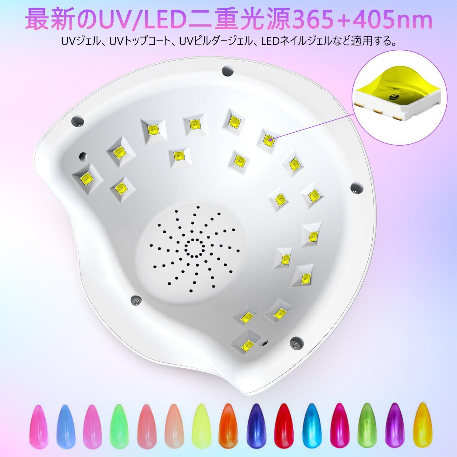 本ネイルライトのLEDの波長は365nm~405nmで、ほとんどのジェルに対応できます!普通のジェルに対応できません。予めご了承してご購入いただけお願い申し上げます。✿✿過熱保護機能、環境によい: 新型ABS素材を利用して、変な匂いがなく、燃えにくく、簡単に腐食しなく、内装は過熱保護施設があり、安全安心利用できます。