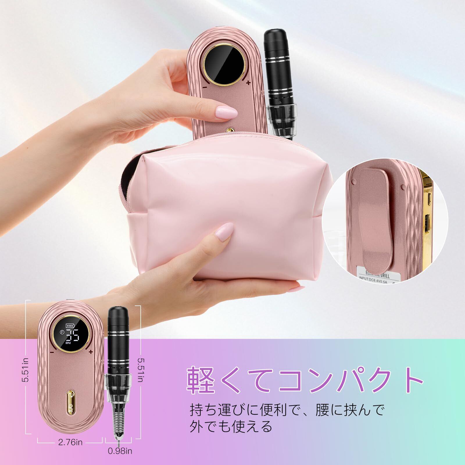コンパクトとクリップデザイン:腰に簡単にクリップしたり、財布、ハンドバッグ、バックパックに入れて、いつでもどこでもネイルケアを楽しめます。大きな円形の速度調節エリアで、理想的な回転速度を簡単にロックし、操作が簡単で迅速です。アルミニウムハンドルは握り心地が良く、長時間使用しても疲れません。