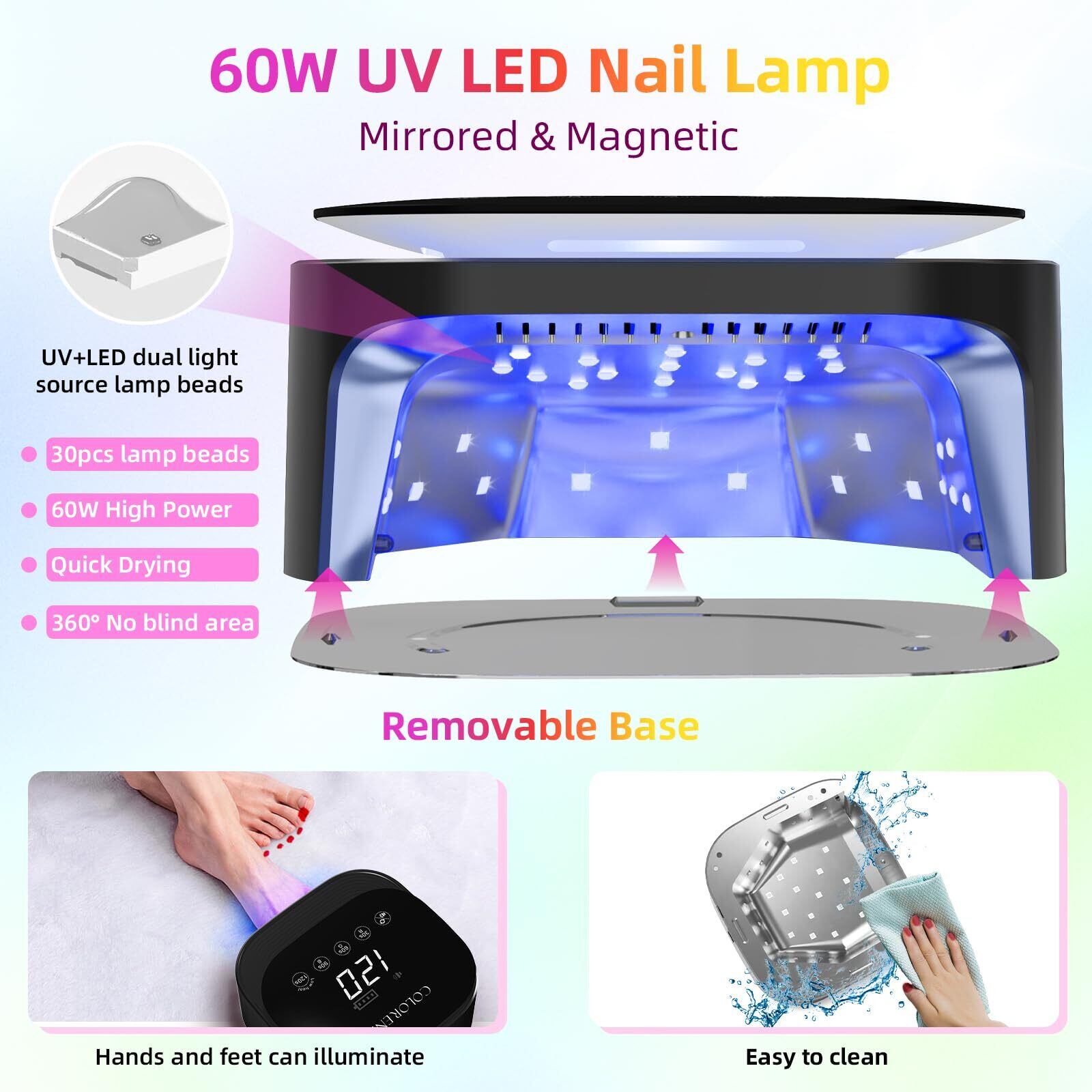 【取外し可能なベース設計】ジェル UV LED ネイルランプは取外し可能な磁気ベースを備えており、分解と清掃が容易です。大きな開口部があり、手全体または足全体を入れることができ、ポリッシュを汚す心配がありません。専門的なサロンと家庭での使用に理想的です。