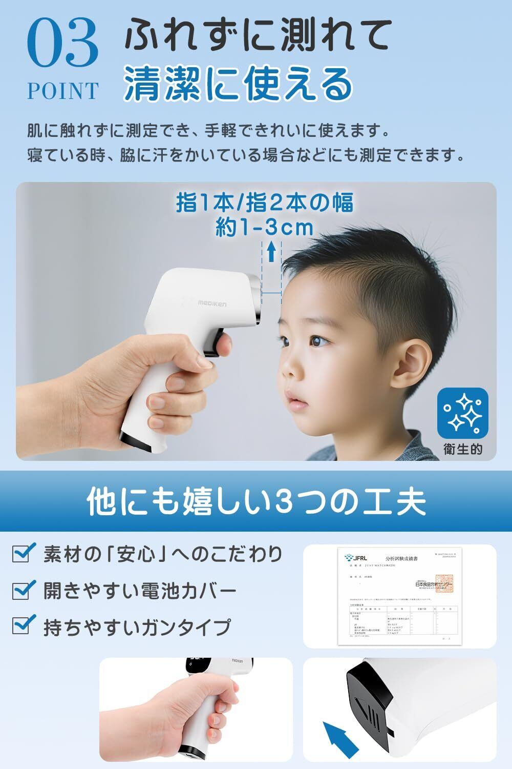 【非接触型】赤外線センサーを搭載し、非接触でわずか1秒で温度を測定できます。