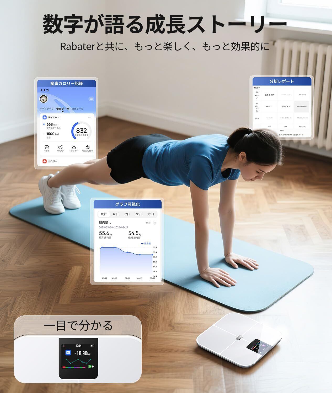 【2025年モデル】【25項目測定 初心者向け 乗るだけで測定】Rabater 体重·体組成計 体脂肪計 CF588BLE ITO技術 スマホ連動 心拍数測定 体重計 Bluetooth5.1 専用アプリ データ自動記録 高精度 180kgまで対応 赤ちゃんモード 体脂肪率/BMI/筋肉量/基礎代謝