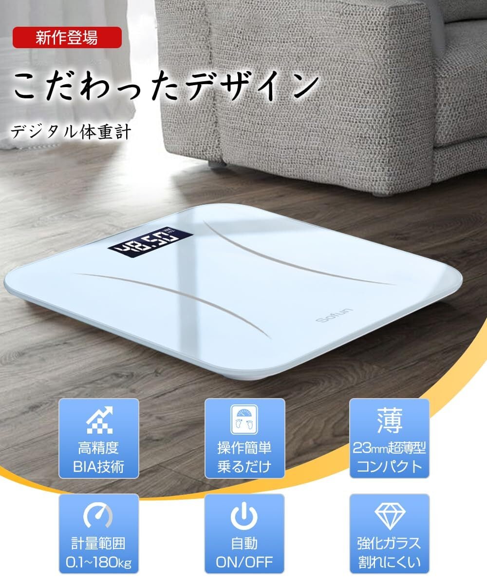 体重計 【新登場・限定・薄型】 ヘルスメーター 乗るだけ 高精度 電源自動ON/OFF バックライト付 180kgまで対応 ボディスケール 強化ガラス 電子スケール コンパクト 軽量 電池付属 (ホワイト)